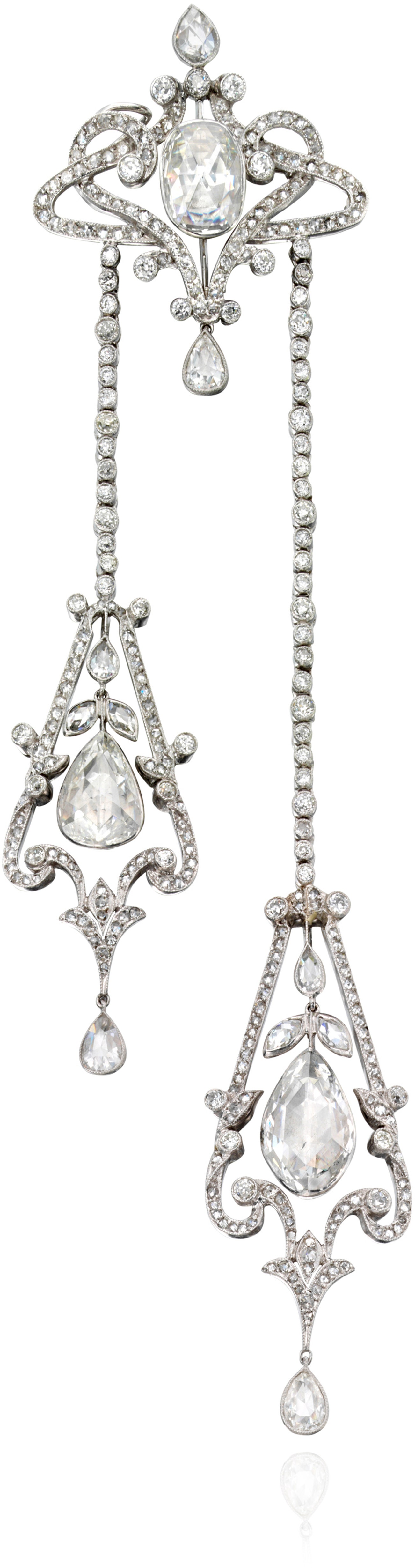 Of négligé and tracery design, set with a cushion-shaped rose-cut diamond accented by pear-, marquise-shaped and circular-cut diamonds, supporting staggered tendrils, each set with a pear-shaped rose-cut diamond, within a frame of pear-, marquise-shaped and circular-cut diamonds, mounted in platinum.