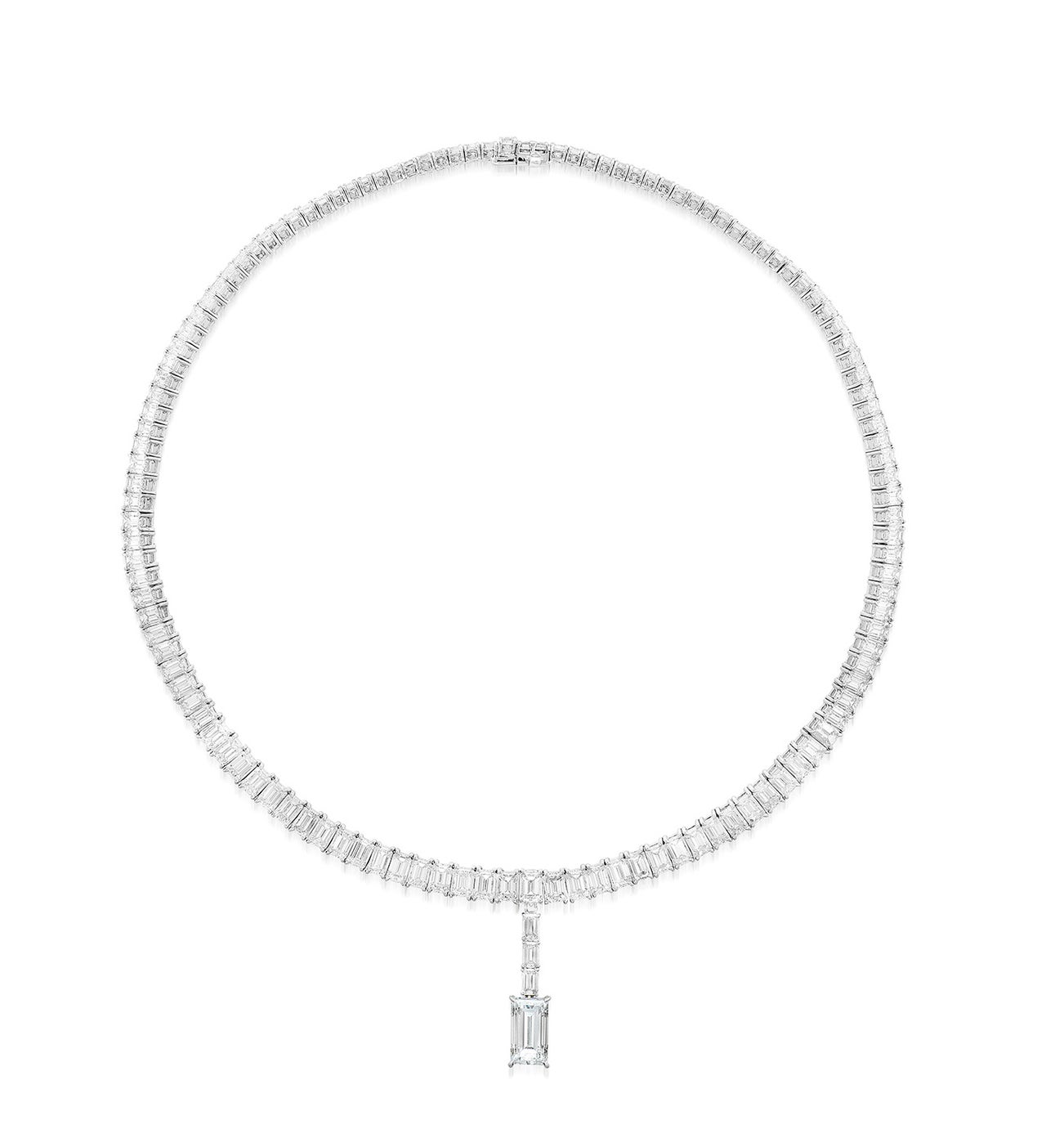Designed as a line of graduated step-cut diamond necklace, supporting a pendant set with baguette diamonds and a rectangular step-cut diamond weighing approximately 3.12 carats, mounted in platinum, necklace length approximately 400 mm.