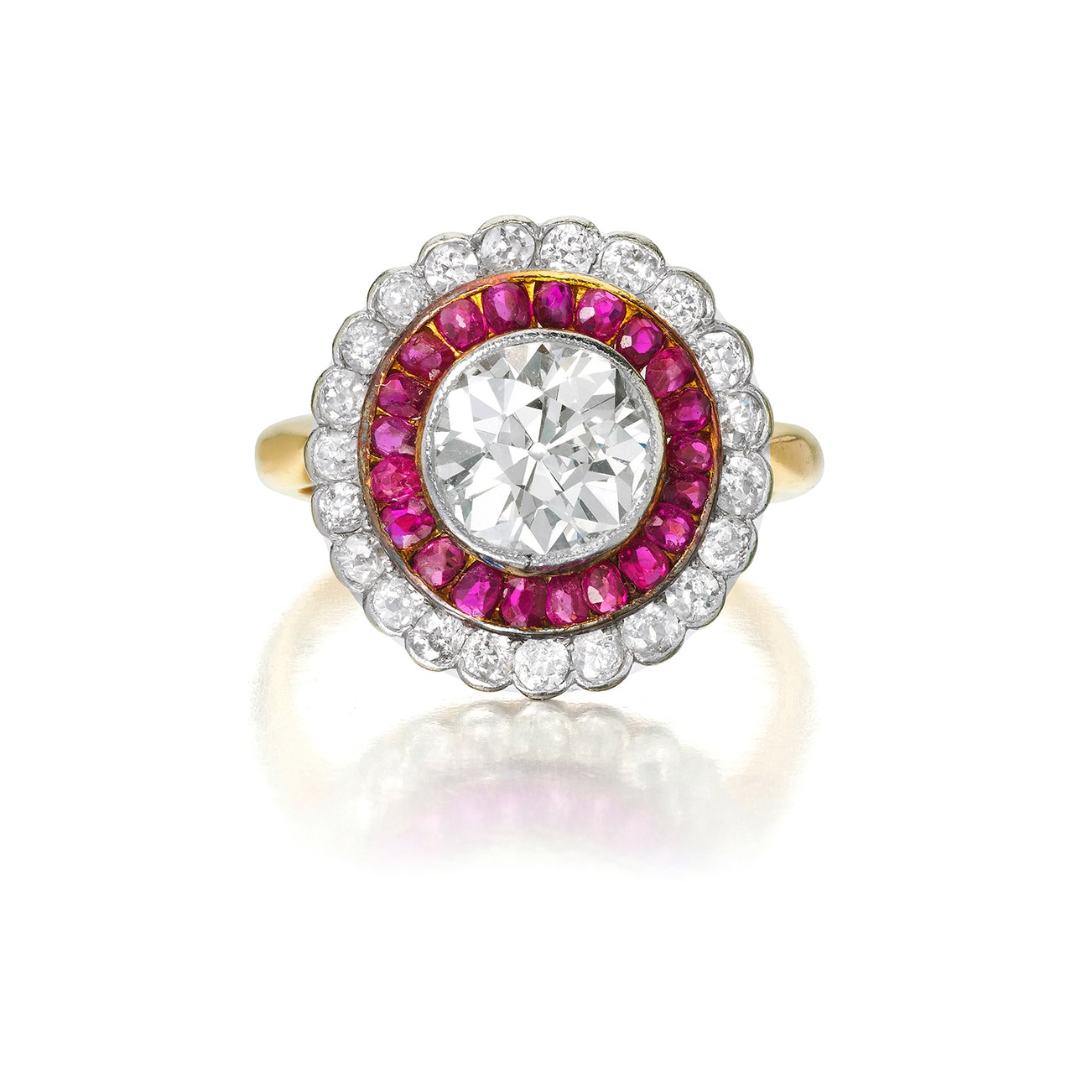 Set with a circular-cut diamond, within a frame of oval rubies, accentuated by a halo of single-cut and old mine-cut diamonds,