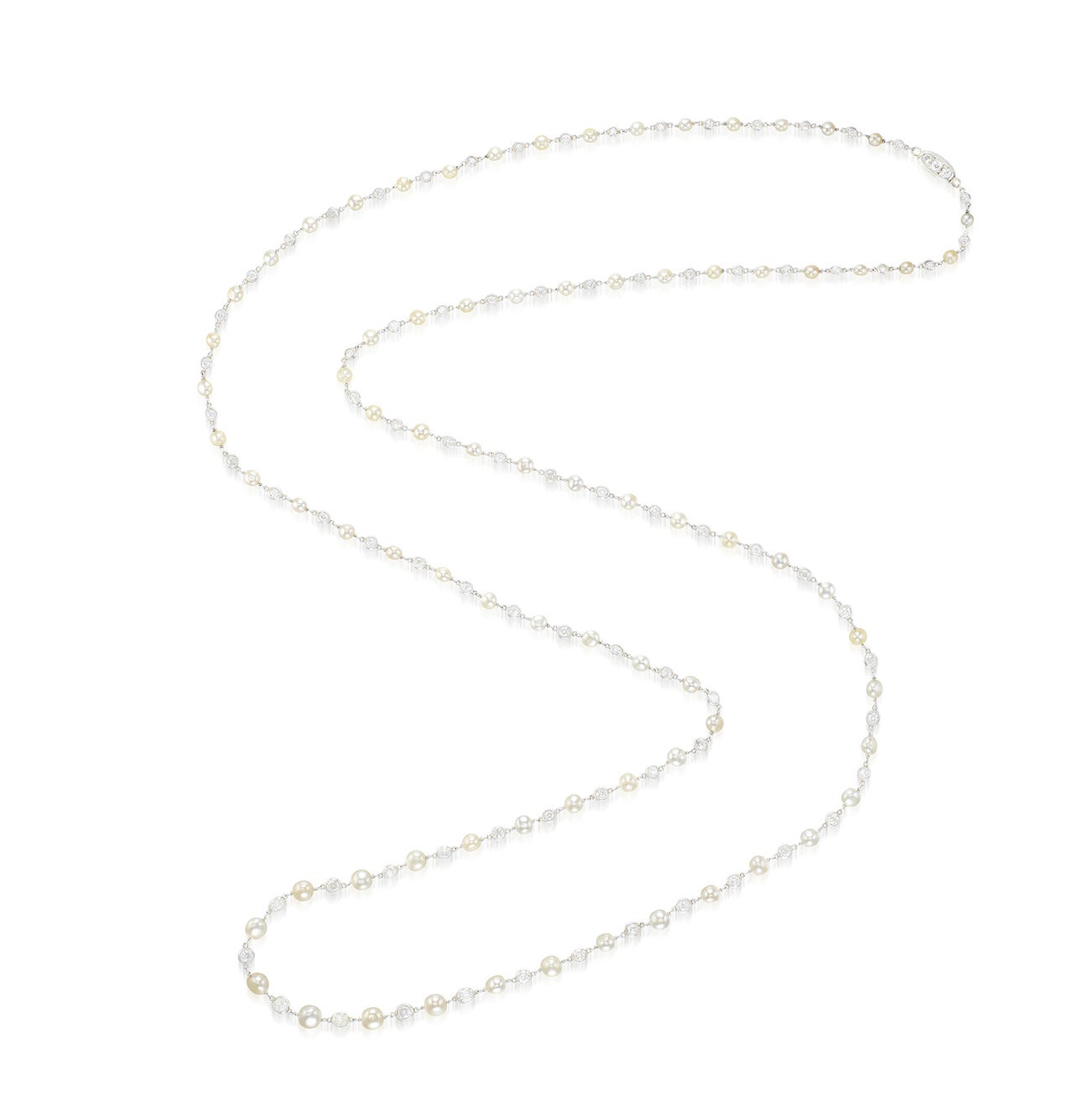Composed of light gray and cream natural pearls measuring approximately from 3.11 to 6.39 mm, enhanced by diamond collets and white gold links spacers, mounted in white gold, length approximately 1117 mm.
