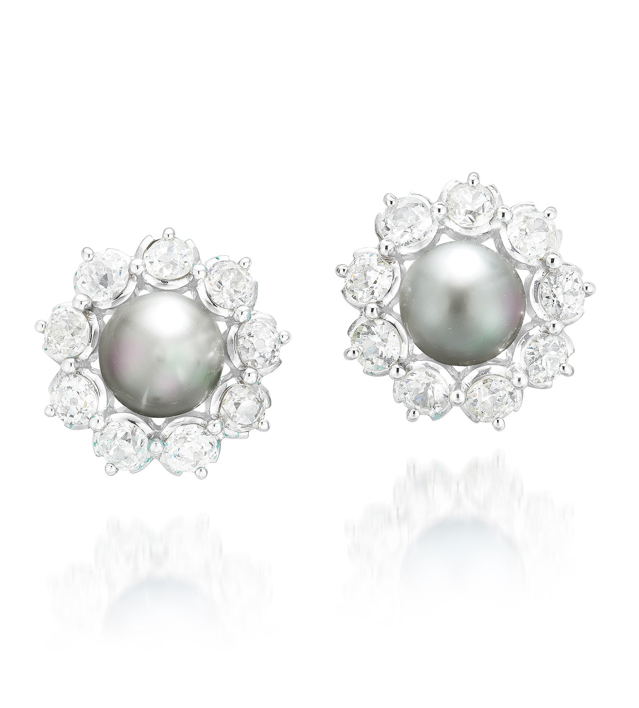 Each set with a button-shaped gray natural pearl measuring approximately 8.27 mm and 8.16 mm, within a circular-cut diamond surround, mounted in white gold, post and hinged back fittings.