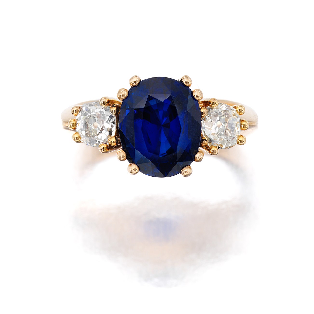 Set with an oval sapphire weighing 3.14 carats, between circular-cut diamonds, mounted in 18k yellow gold, size 4.5.