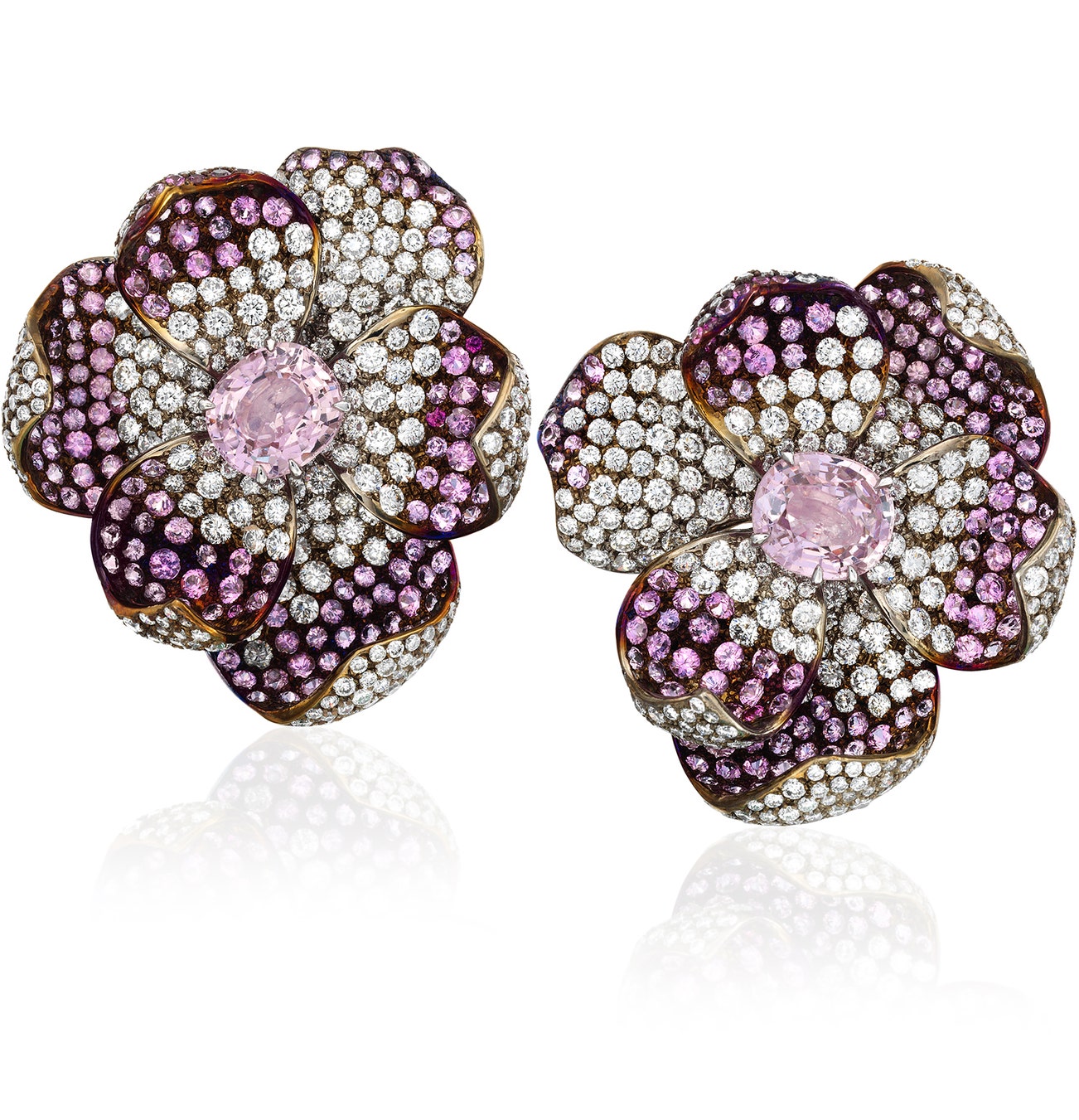 Each designed as a flower, set with an oval spinel, accented by brilliant-cut diamonds and circular-cut spinels, mounted in titanium and 18k yellow gold, with omega clips.