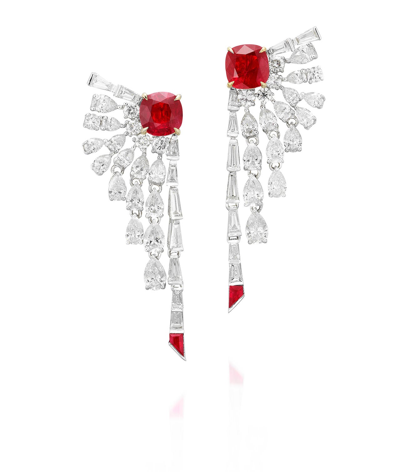 Each set with a cushion-shaped ruby weighing approximately 1.11 and 1.01 carats respectively, and pear-shaped, brilliant-cut and tapered baguette diamonds, accented by a calibré-cut ruby terminal, mounted in white gold, post and butterfly fittings.