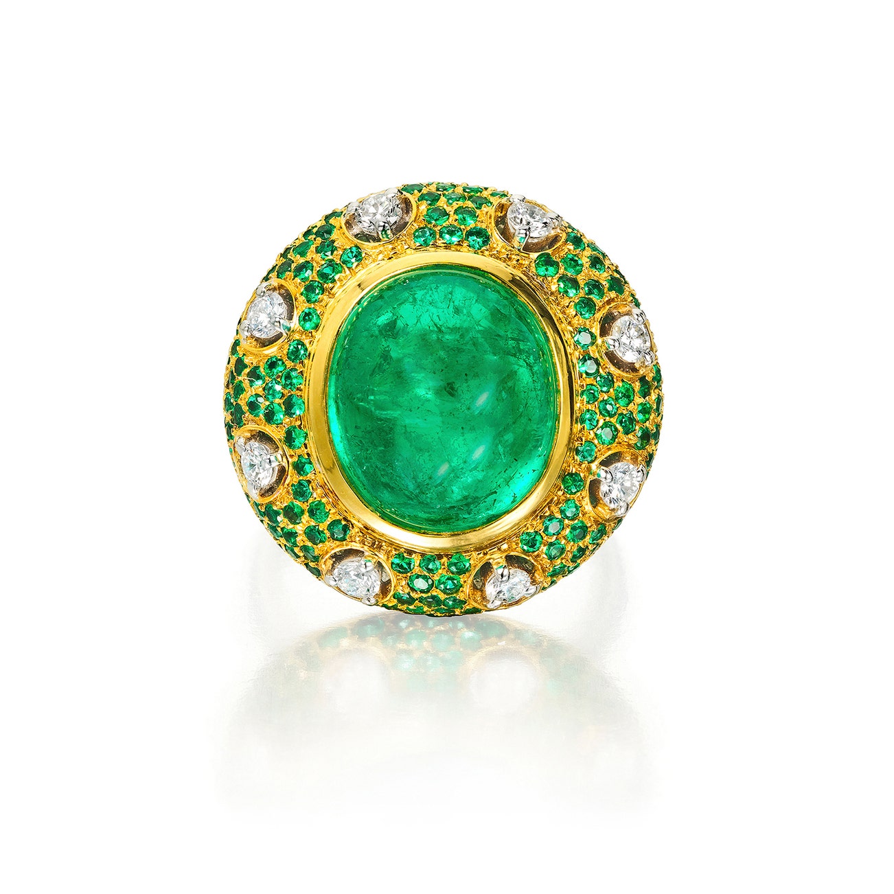 Set with an oval cabochon emerald, edged by a halo of circular-cut emeralds accented by brilliant-cut diamonds, mounted in 18k yellow and white gold, Italian maker's mark and assay mark for 18k gold, size 9.25