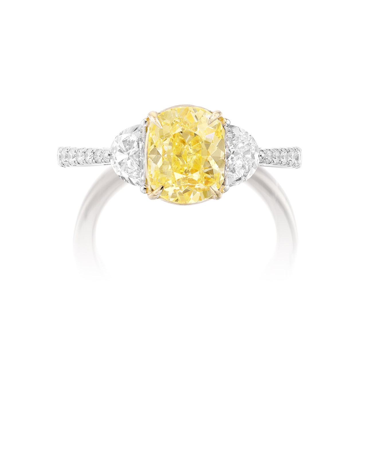 Set with a cushion-shaped fancy intense yellow diamond weighing approximately 2.01 carats, between half-moon diamond shoulders, the mount set with brilliant-cut diamonds, mounted in white gold and gold, size 6¾.