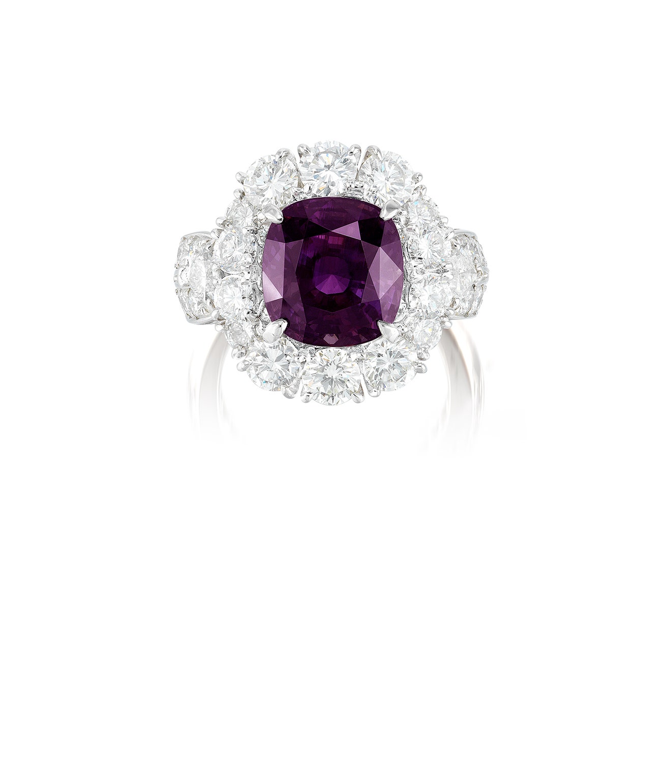 Set with a cushion-shaped alexandrite weiging 5.77 carats, within a brilliant-cut diamond surround, and heart-shaped and brilliant-cut diamond shoulders, mounted in platinum, size 5¾.