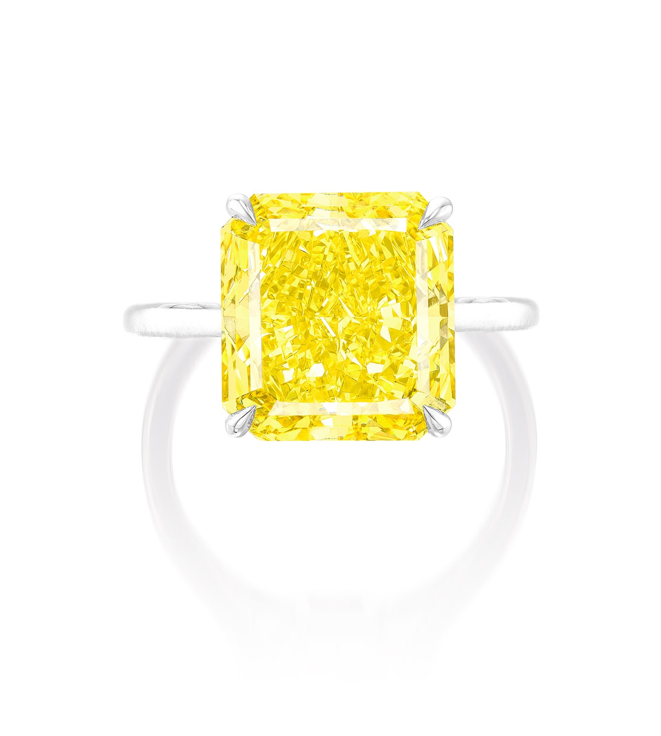 Set with a cut-cornered rectangular mixed cut fancy vivid yellow diamond weighing approximately 7.18 carats, mounted in white gold, size 6.