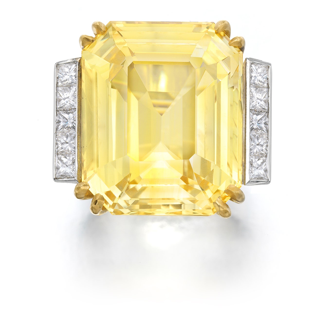 Set with a step-cut yellow sapphire weighing 38.14 carats, between princess-cut diamonds, mounted in 18k white and yellow gold, size 6.5.