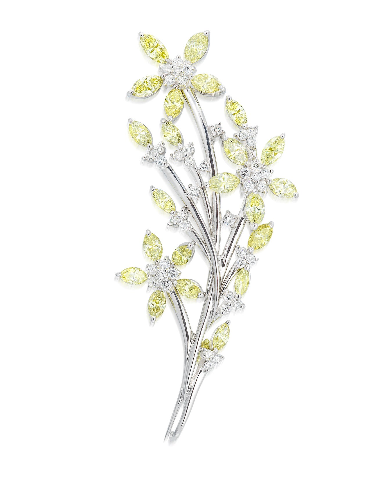 Designed as a flower spray, set with marquise-shaped diamonds of yellow tint and brilliant-cut diamonds,