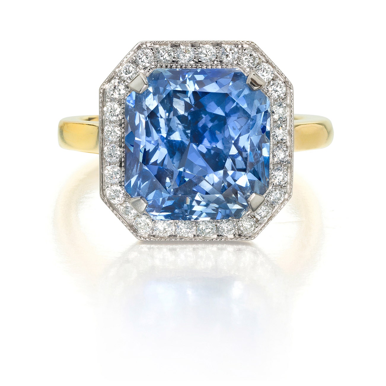 Set with an octagonal modified brilliant-cut sapphire weighing 8.78 carats, edged by a halo of brilliant-cut diamonds, mounted in 18K yellow gold, size 5.75.
