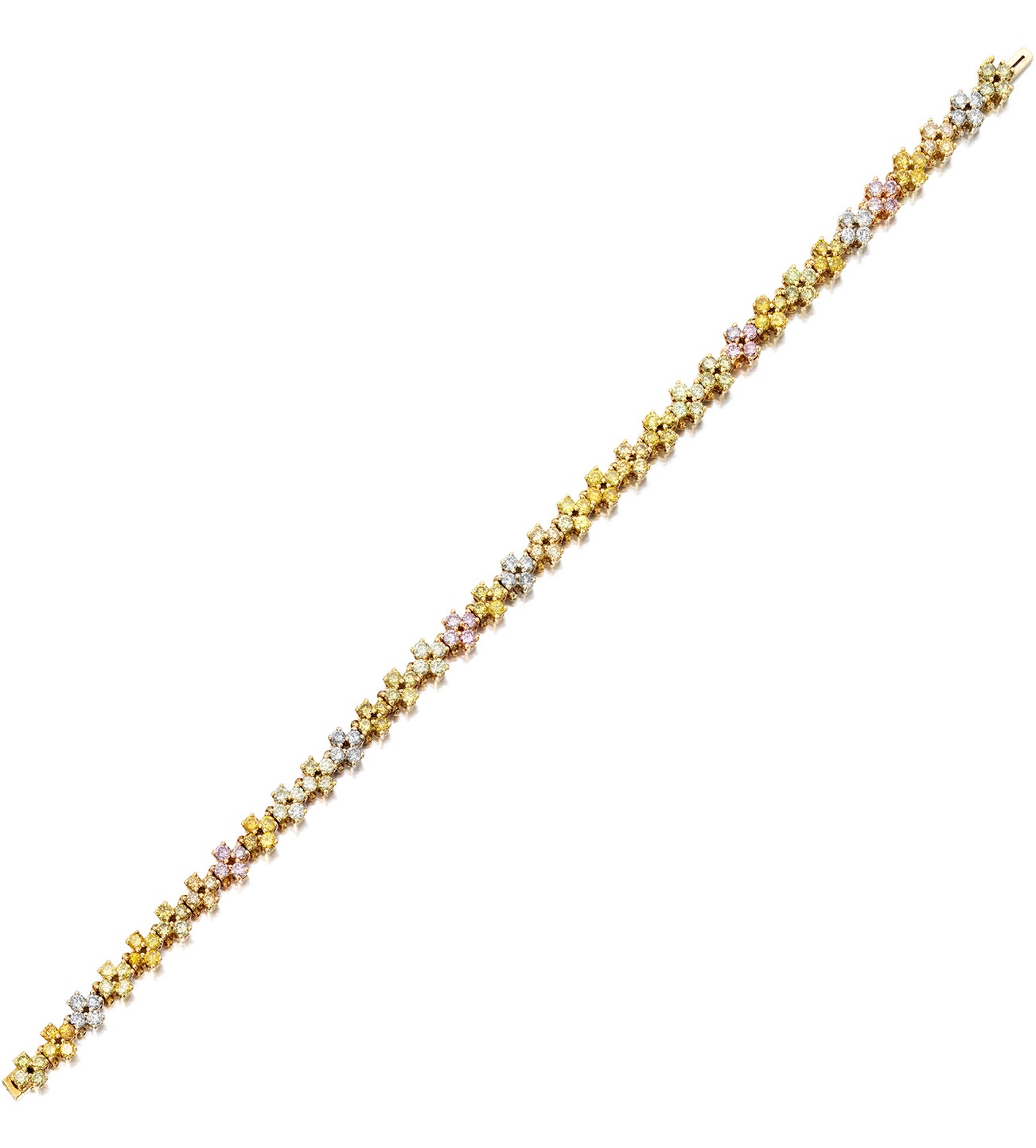 Set with diamonds of yellow, orange, and pink tint, and near-colorless diamonds,