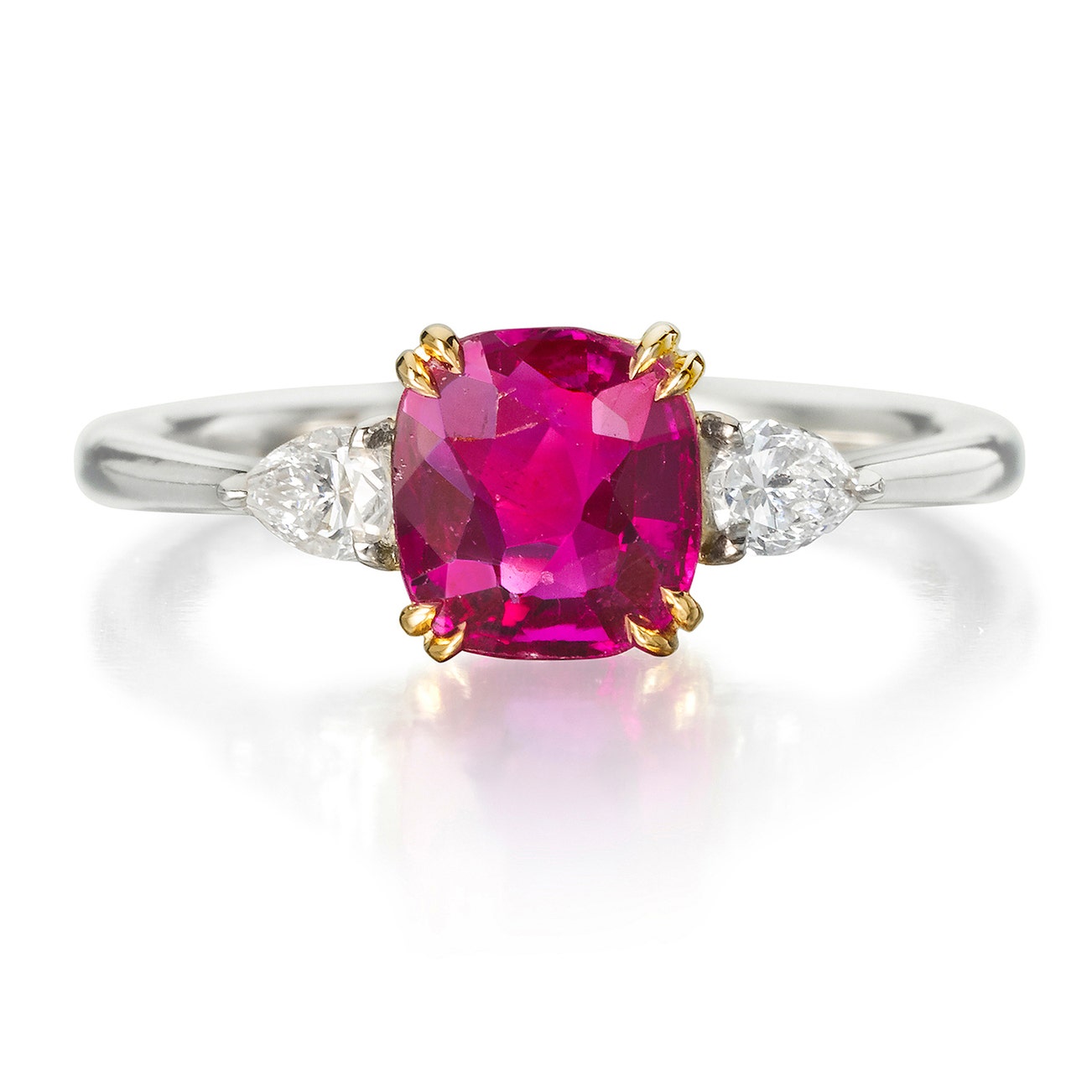 Set with a cushion-shaped ruby weighing 1.29 carats, between pear-shaped diamonds, mounted in 18k yellow gold and platinum, size 6, maker's mark.