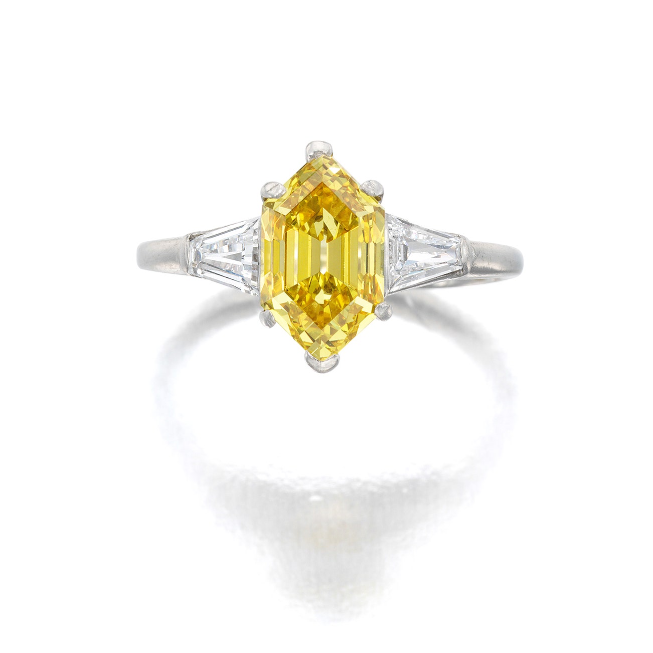 Set with a modified hexagonal step-cut fancy vivid yellow diamond weighing 2.60 carats, between tapered baguette diamond shoulders, mounted in 18k white gold, size 8.