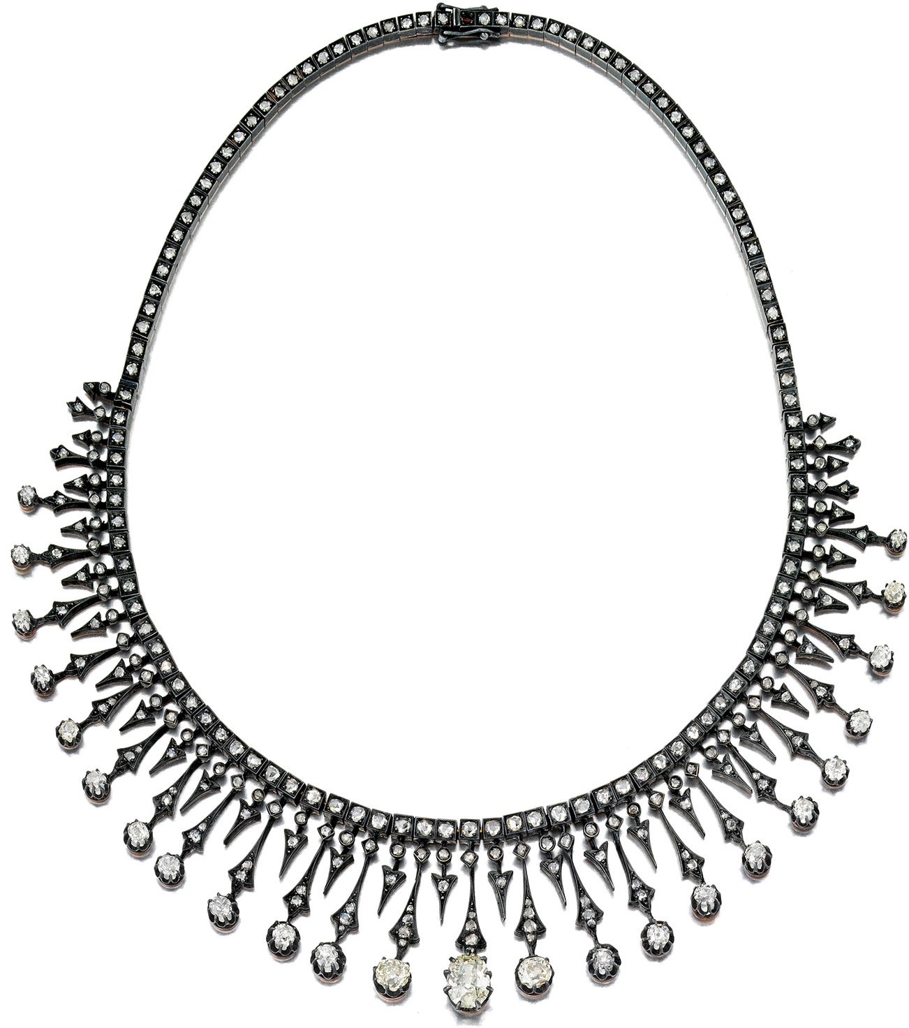 The front designed as an alternating series of spike motifs and knife-edge drops set with an oval diamond, accented by rose-cut and old-cut diamonds, the back set with rose-cut diamonds, mounted in silver-topped 18k yellow gold, length approximately 16 inches, French assay marks for 18k gold.