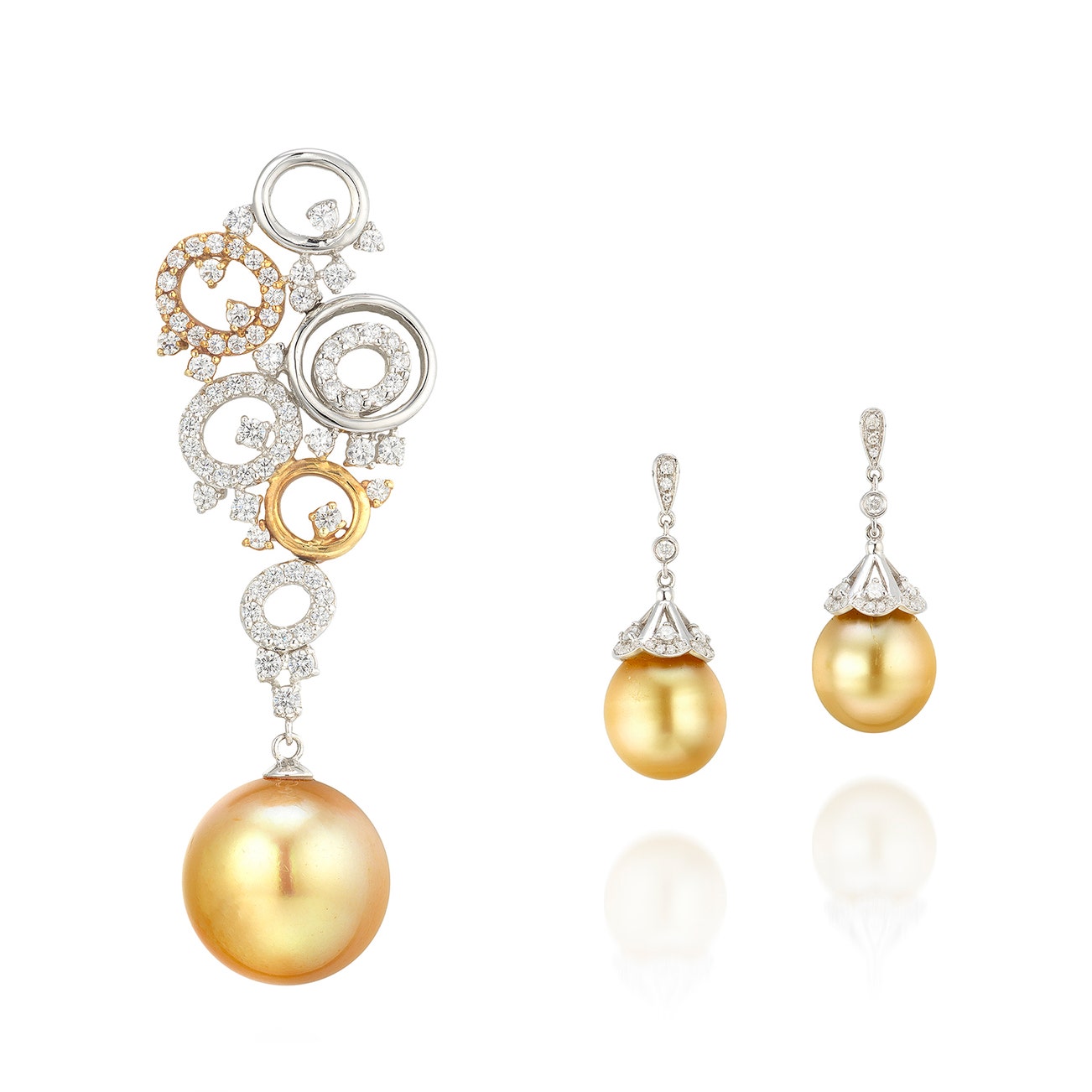 The pendant suspending a golden cultured pearl measuring approximately 15.53 mm, decorated with circular-cut diamonds, mounted in white and yellow gold, length approximately 61mm; and a pair of ear pendants, each suspending a golden cultured pearl measuring approximately 9.47 and 9.20 mm respectively, mounted in white gold, post and butterfly fittings, length approximately 22 mm.