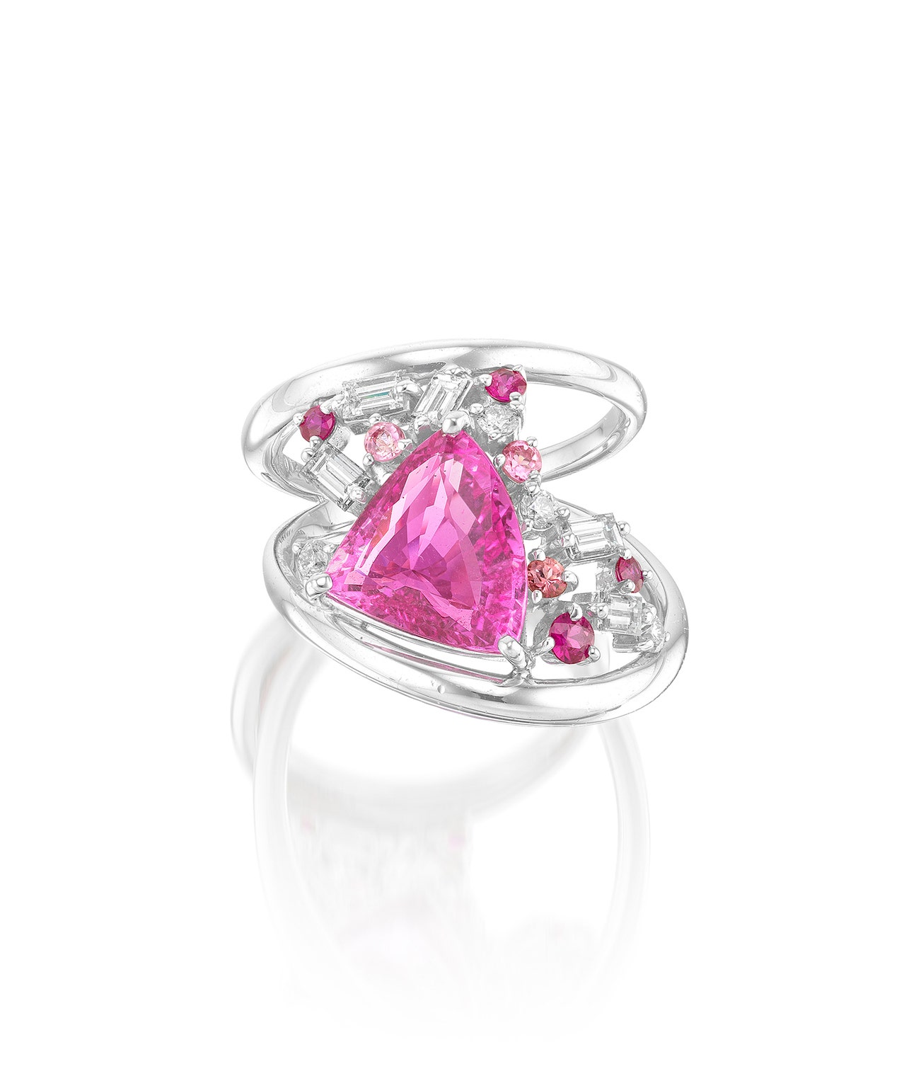 A triangular-shaped pink sapphire weighing approximately 3.75 carats set between a split ring band, accented with circular-cut rubies and pink sapphires, baguette and brilliant-cut diamonds, mounted in platinum, size 6½.