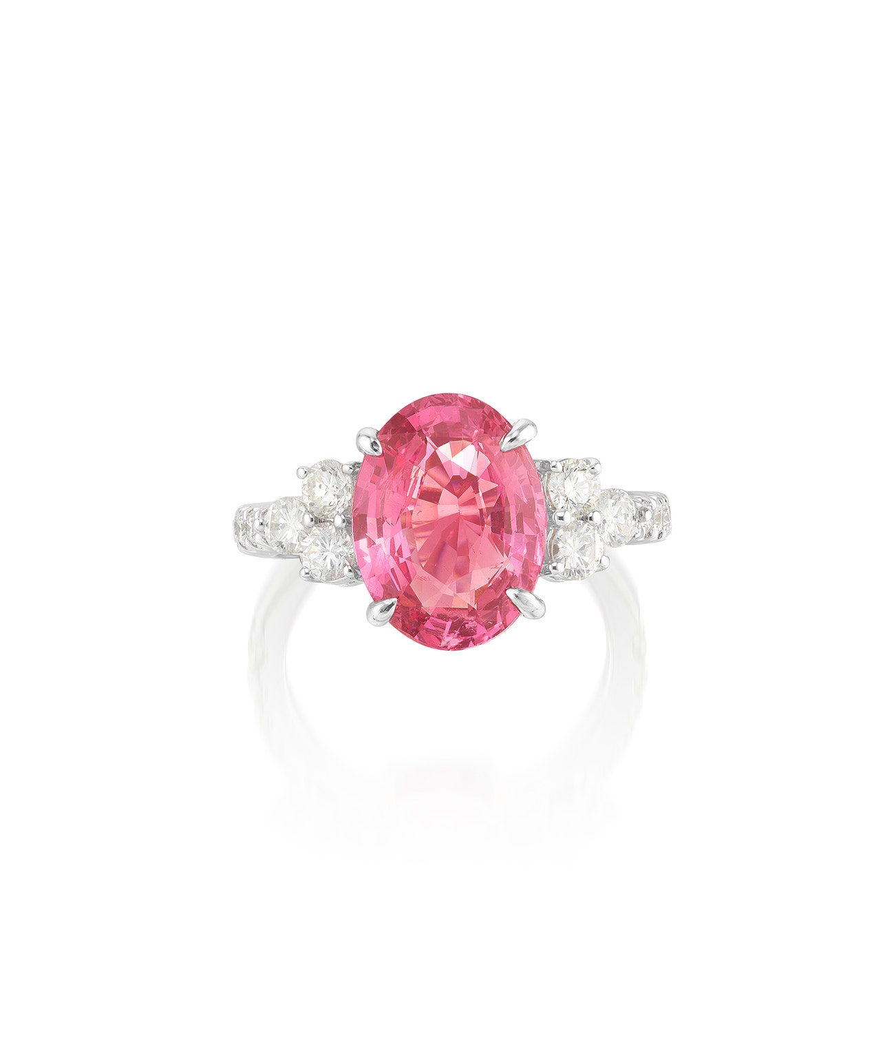 Set with an oval pink spinel weighing approximately 4.08 carats, flanked by brilliant-cut diamonds, between brilliant-cut diamond shoulders, mounted in white gold, size 7.
