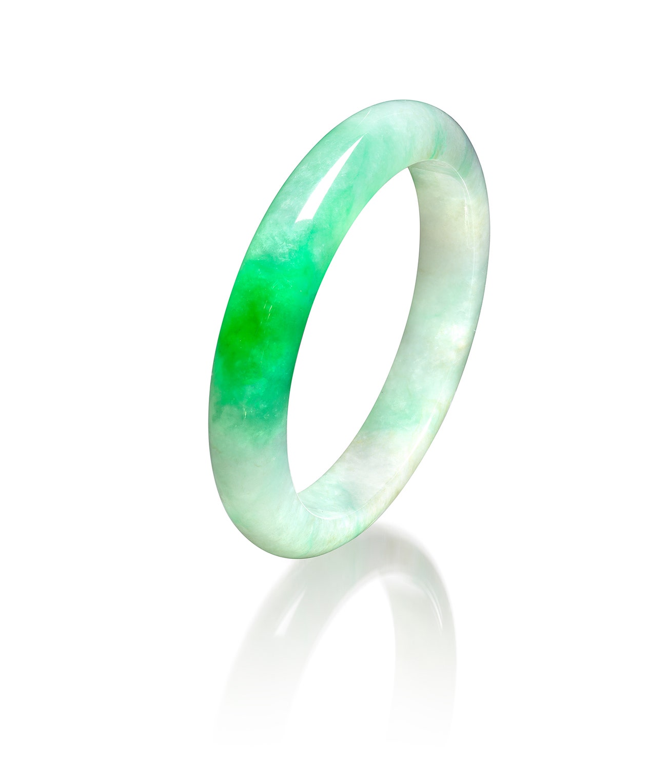 A circular jadeite bangle of good translucency with a section of bright green colour, inner circumference approximately 170 mm.