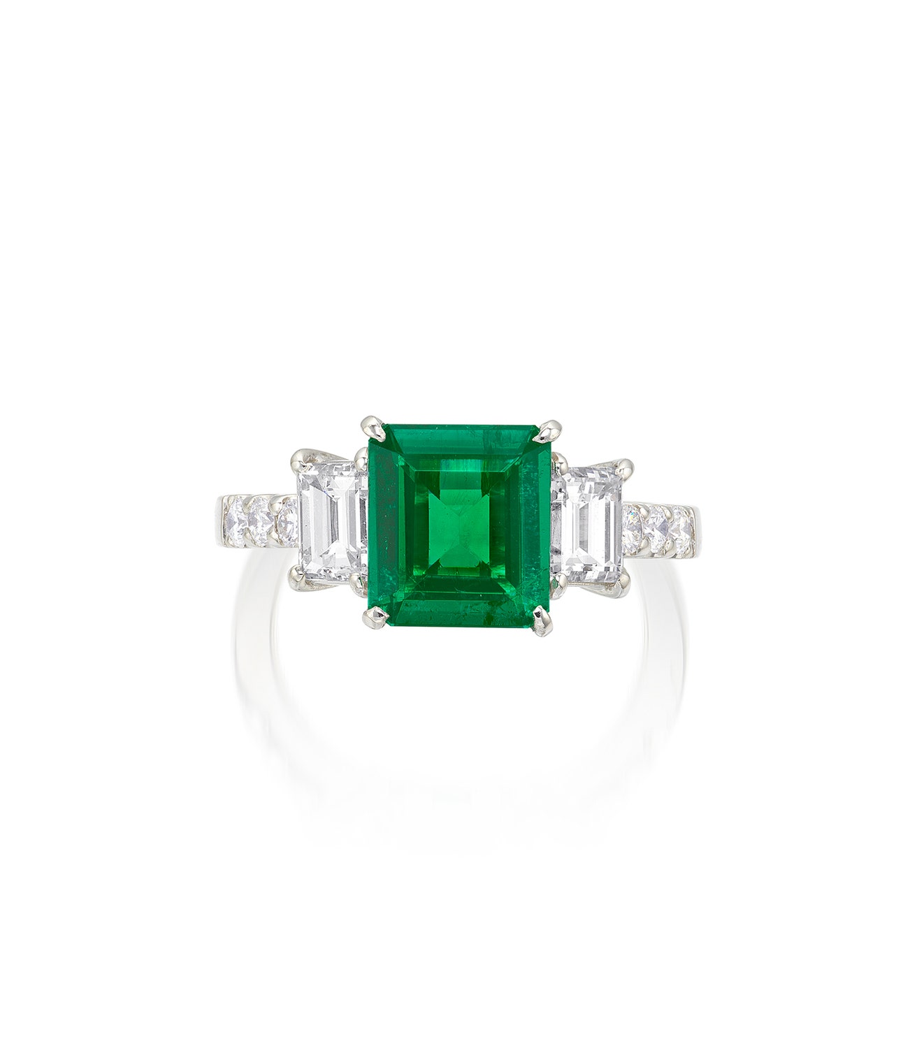 Set with a step-cut emerald weighing approximately 2.11 carats, flanked by two rectangular step-cut diamonds weighing 0.65 and 0.52 carat respectively, between brilliant-cut diamond shoulders, mounted in platinum, size 7.