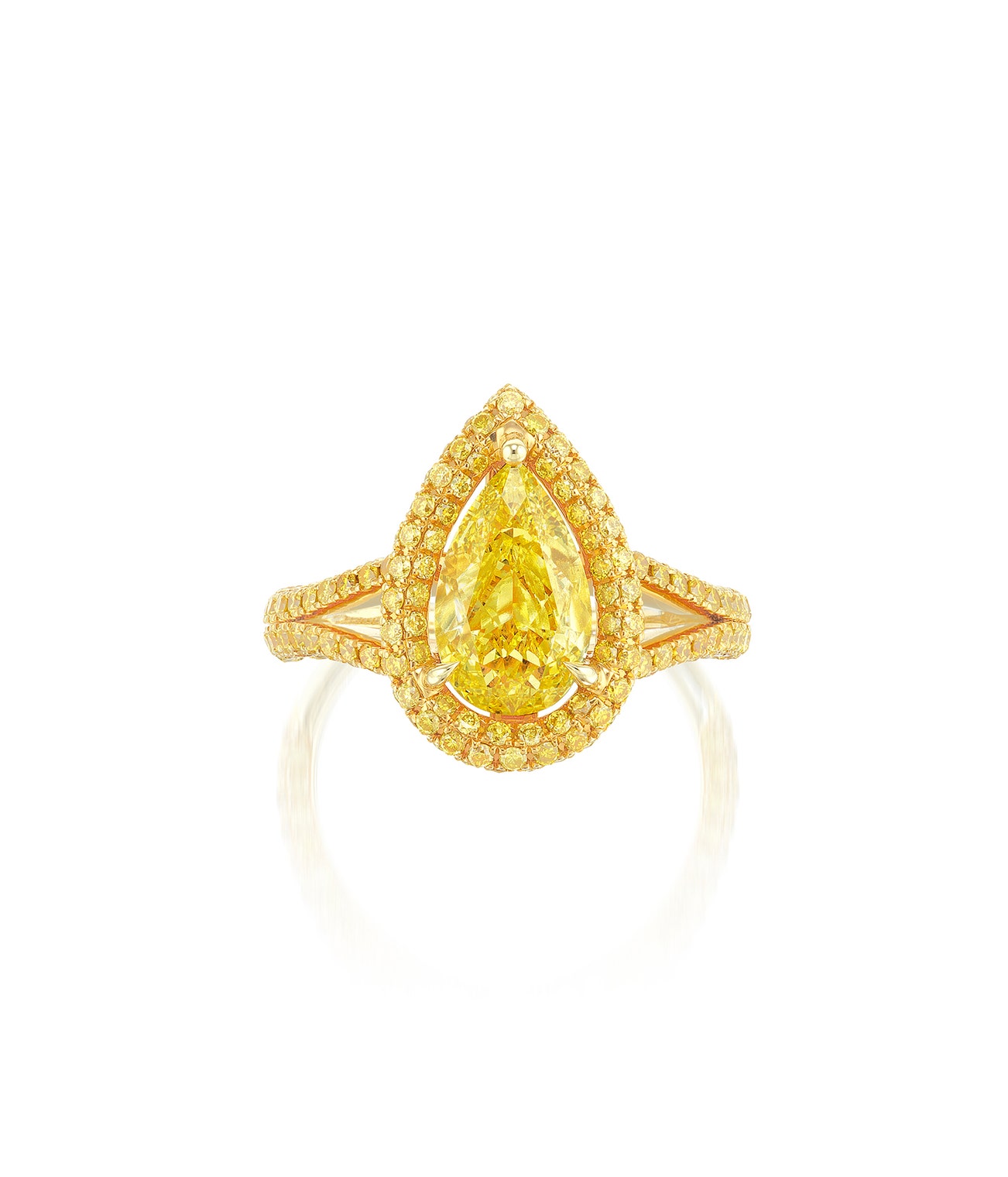 Set with a pear-shaped fancy vivid yellow diamond weighing 1.79 carats, to a surround and shoulders set with brilliant-cut diamonds of yellow tint, mounted in yellow gold, size 6¾.