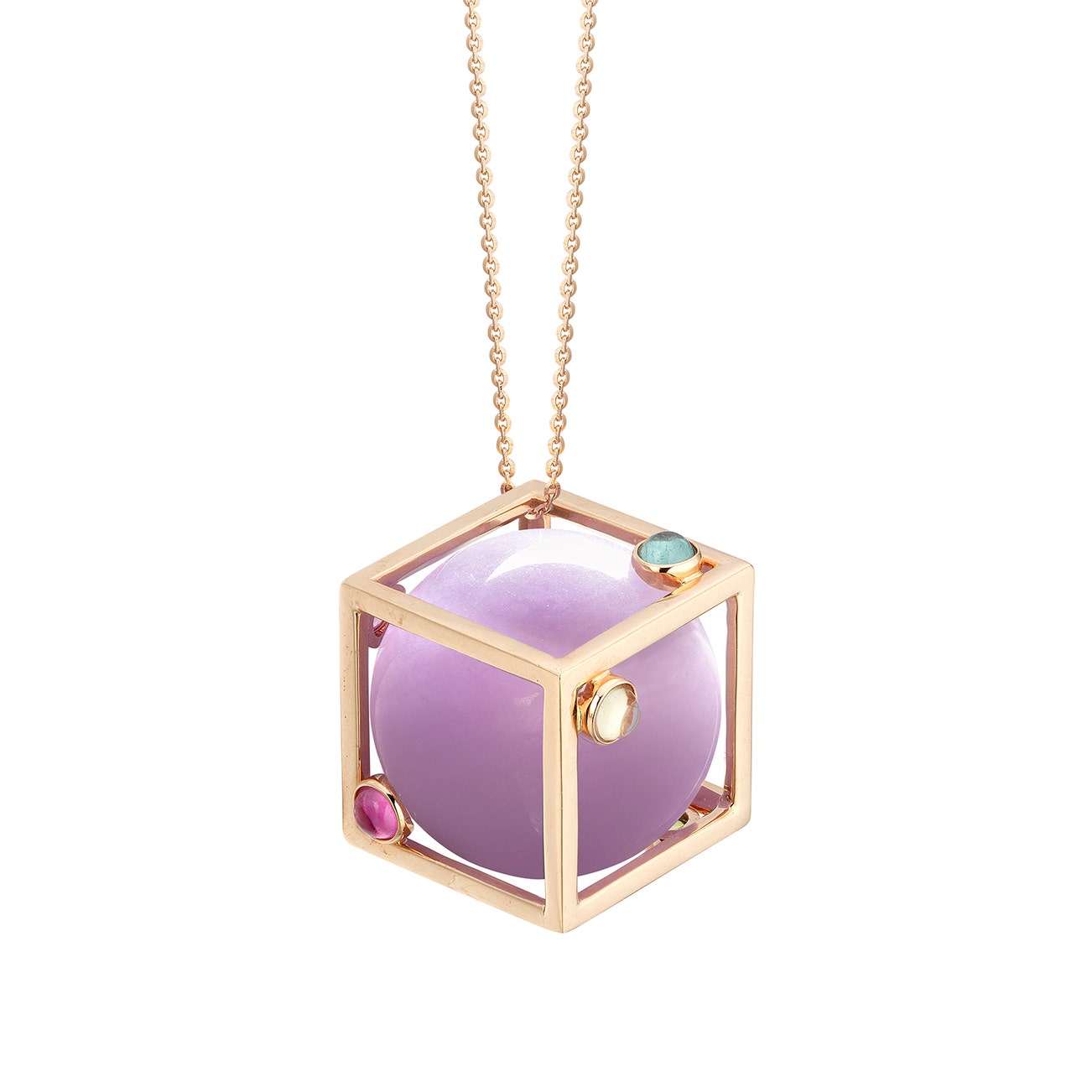 Set with a lavender jadeite sphere measuring approximately 19.69 mm, within a pink gold frame, highlighted with cabochon coloured tourmalines, with a fine link chain, mounted in pink gold, pendant length approximately 22 mm, link chain length approximately 440 mm.