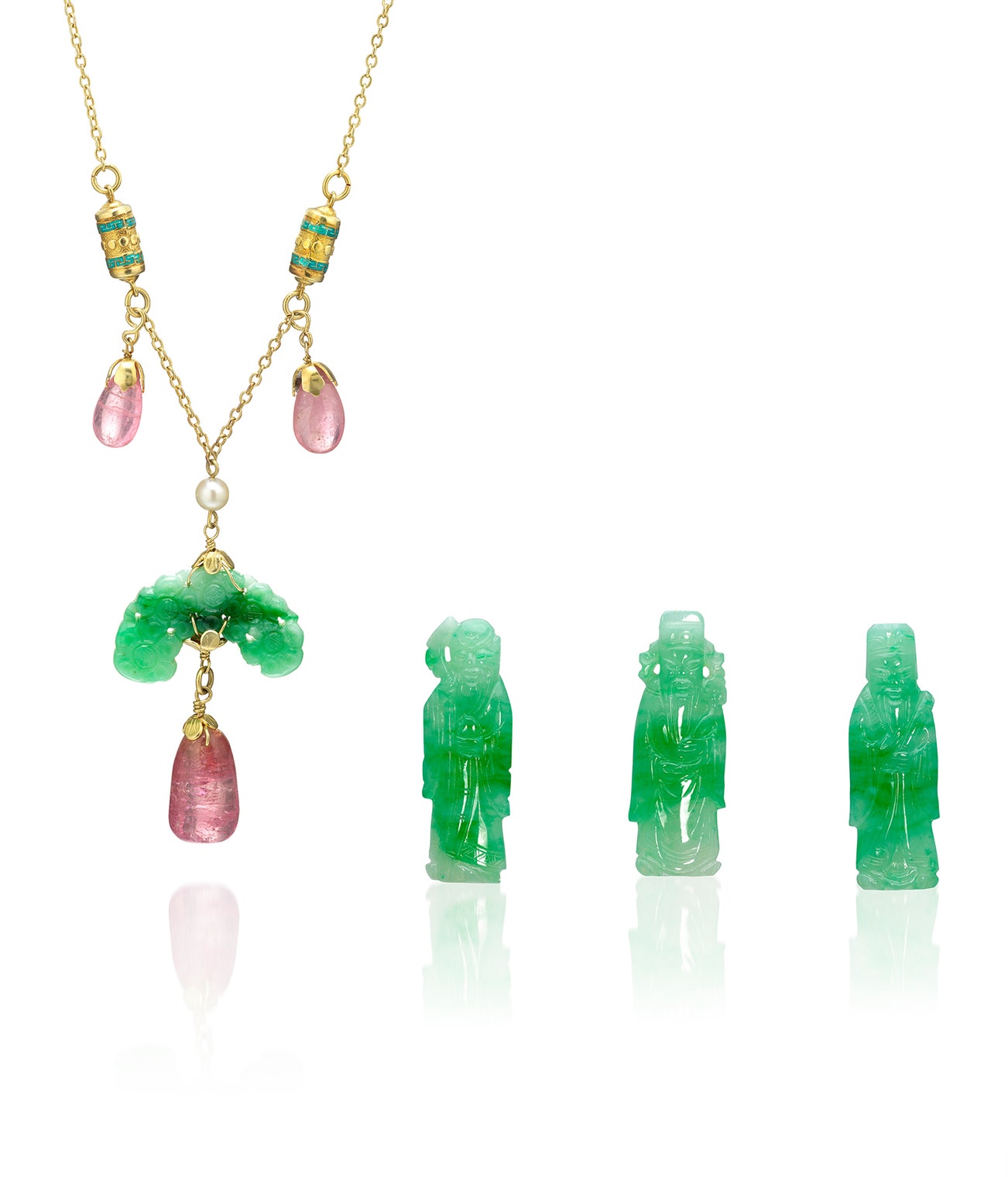 Comprising: three jadeites of bright green colour carved as 'Fu Lu Shou' deities, measuring approximately 12.0 x 36.0 to 13.0 x 37.0 mm; and a pendent necklace, set with a carved jadeite plaque of bright green colour, suspended and highlighted by drop-shaped tourmalines and a round white pearl, with a link chain, mounted in yellow gold, pendant length approximately 55 mm, link chain approximately 440 mm.
