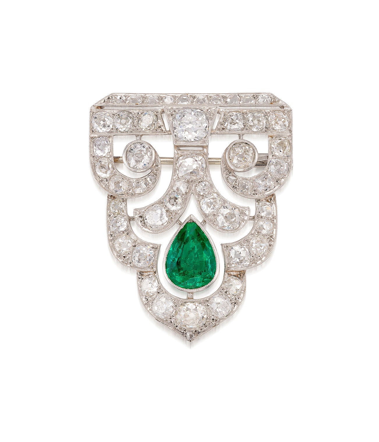 Set with a pear-shaped emerald weighing approximately 2.00 carats, decorated with old mine- and old European-cut diamonds, mounted in platinum, French assay mark, maker's mark, length approximately 31 mm.