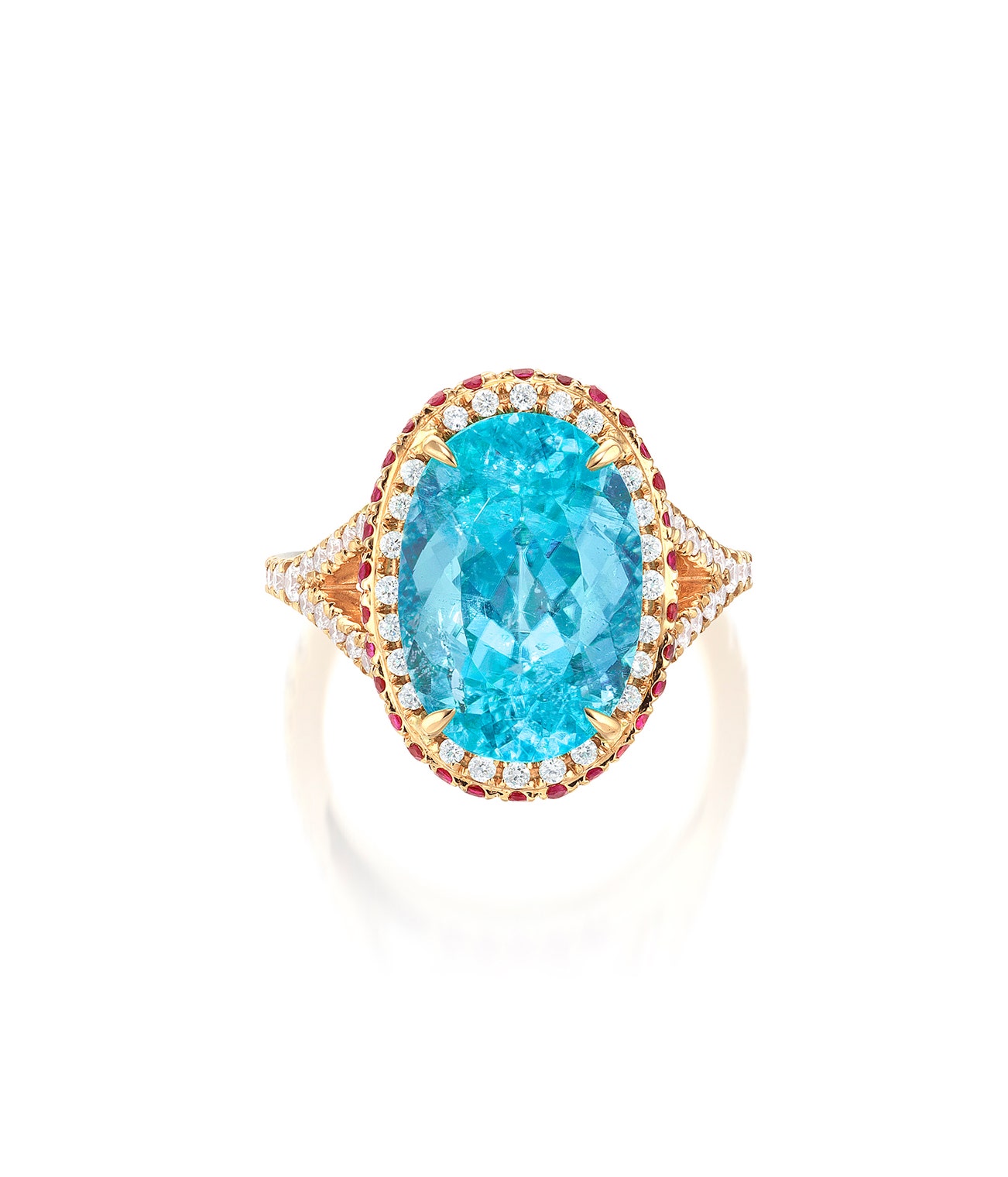 Set with an oval paraíba tourmaline weighing approximately 6.00 carats, surrounded by circular-cut rubies and brilliant-cut diamonds, mounted in yellow gold, size 5¾.