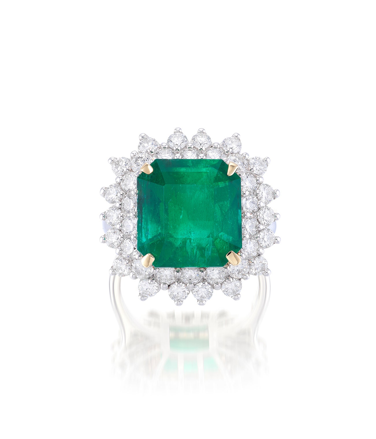 Set with a step-cut emerald weighing approximately 7.05 carats, surrounded by brilliant-cut diamonds, mounted in platinum and yellow gold, size 6½.