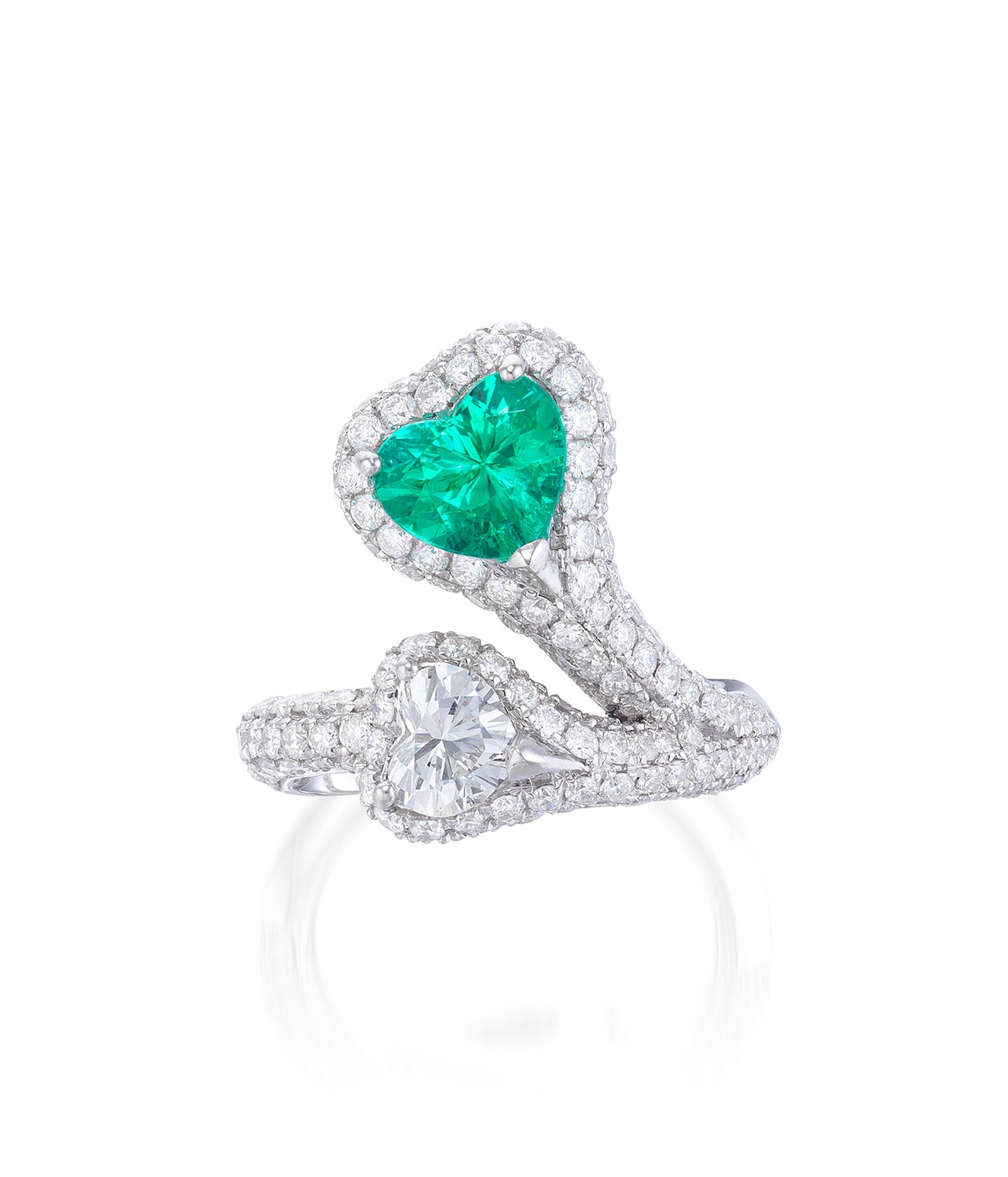 Set with a heart-shaped paraíba tourmaline weighing 1.56 carats and a heart-shaped diamond weighing 0.62 carat, highlighted with brilliant-cut diamonds, mounted in platinum, size 6½.