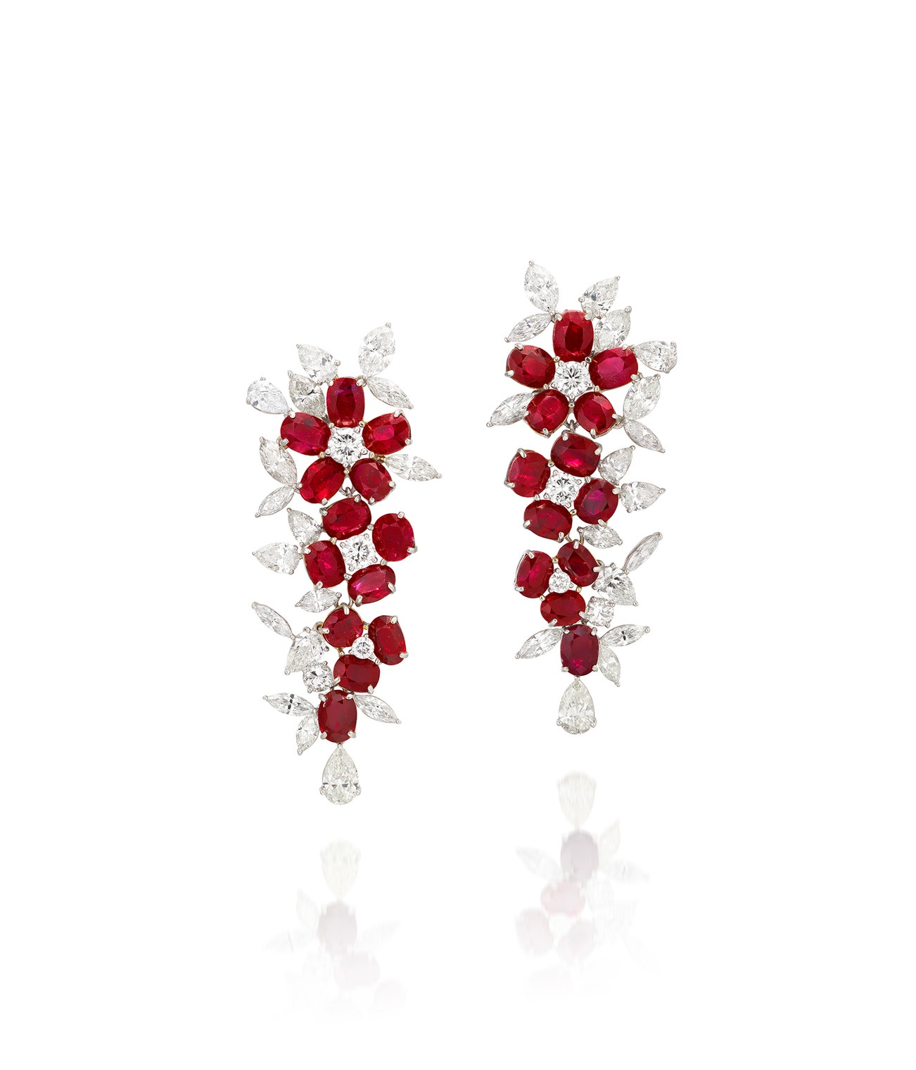 Of cascading floral design, set with twenty-six oval and cushion-shaped rubies weighing 26.20 carats in total, decorated with marquise- and pear-shaped diamonds, mounted in white and yellow gold, post and hinged back fittings, length approximately 61 mm.