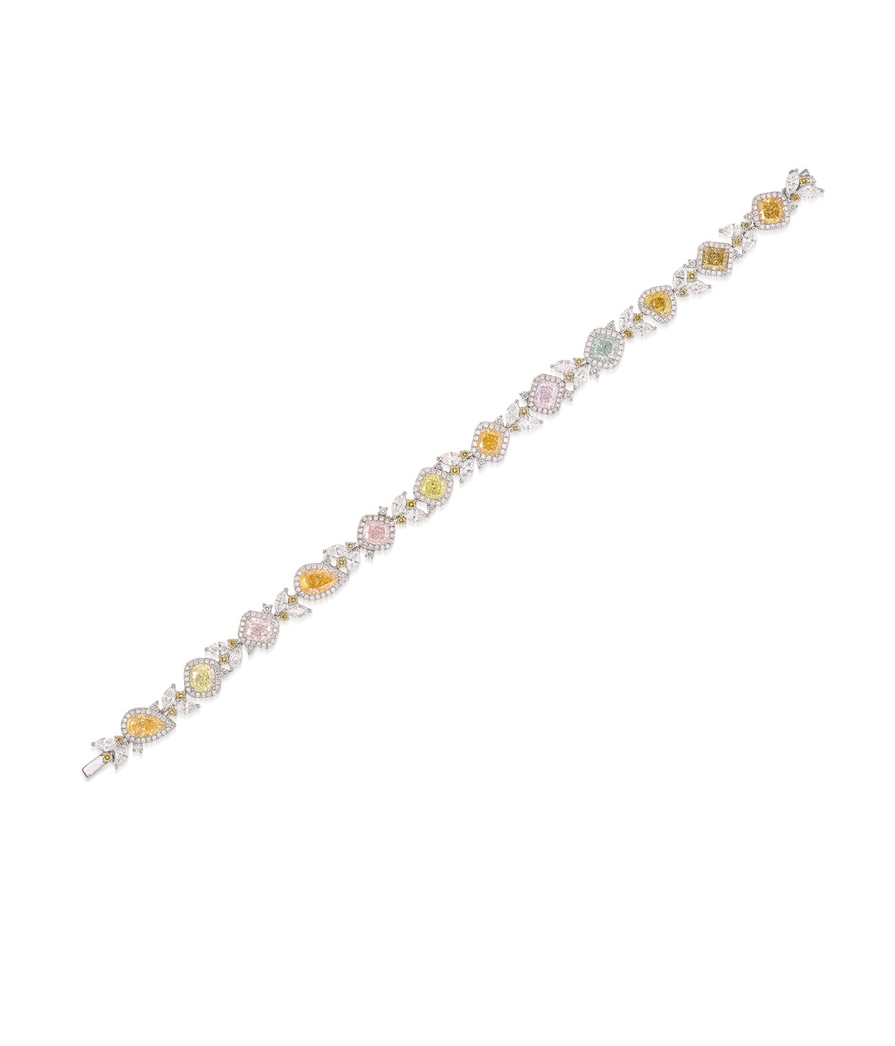 Set with twelve coloured diamonds of various shapes and cuttings weighing 0.50 to 0.77 carat, highlighted with brilliant-cut and marquise-shaped diamonds and brilliant-cut diamonds of yellow tint, mounted in white gold, length approximately 167 mm.