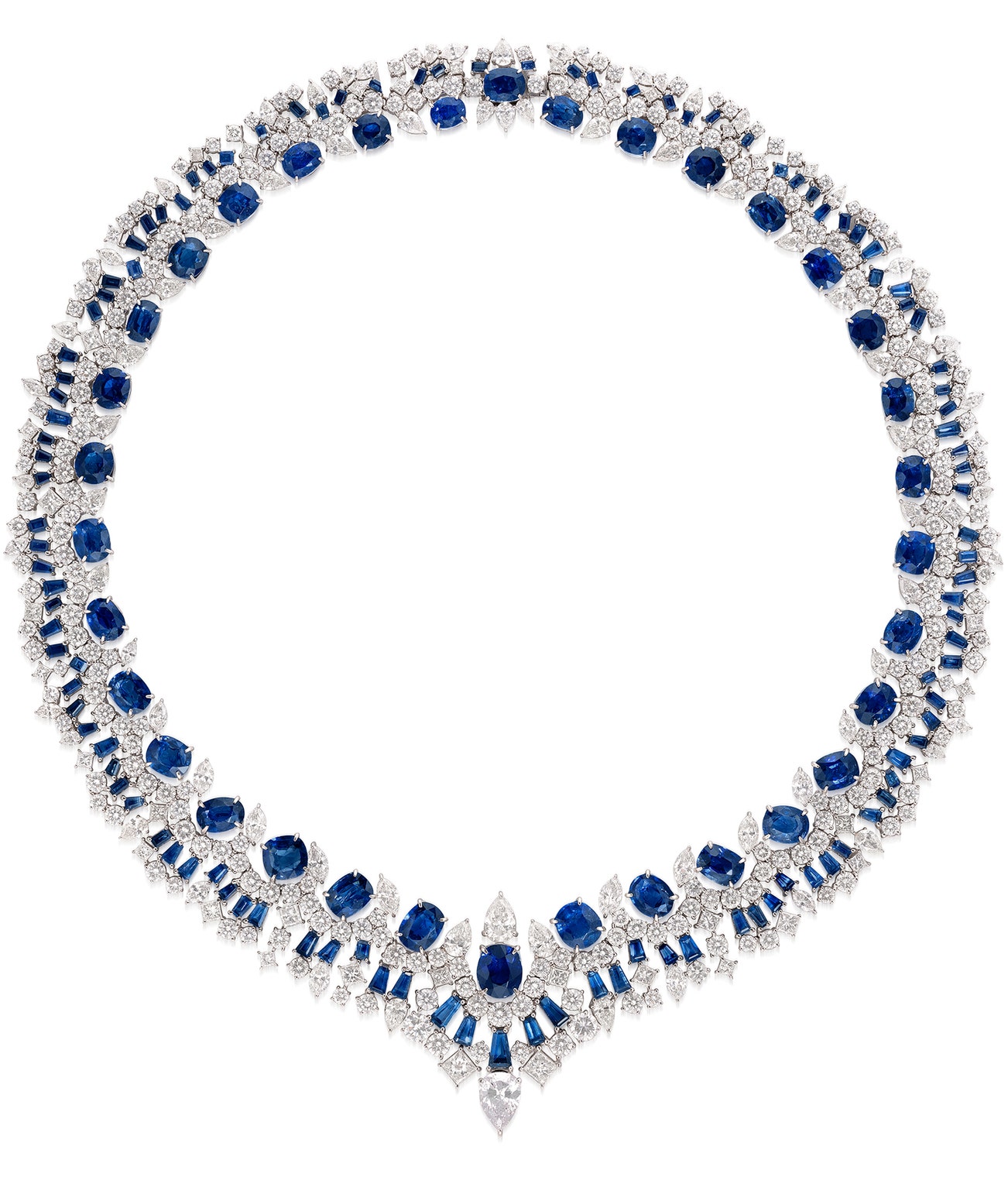 Set with thirty-four oval and cushion-shaped sapphires weighing approximately 34.30 carats in total, highlighted with variously-cut diamonds and sapphires, mounted in white gold, length approximately 400 mm.