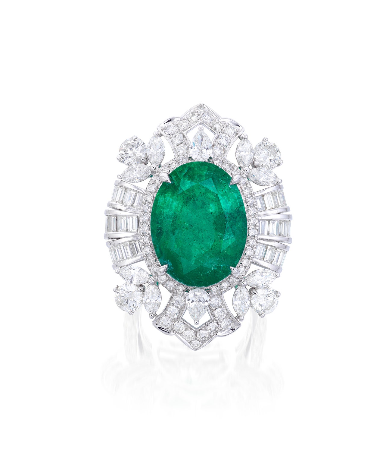 Set with an oval emerald weighing approximately 15.43 carats, within a brilliant-cut diamond surround, highlighted with variously-cut diamonds, shoulders set with brilliant-cut diamonds, mounted in white gold, size 5¾.