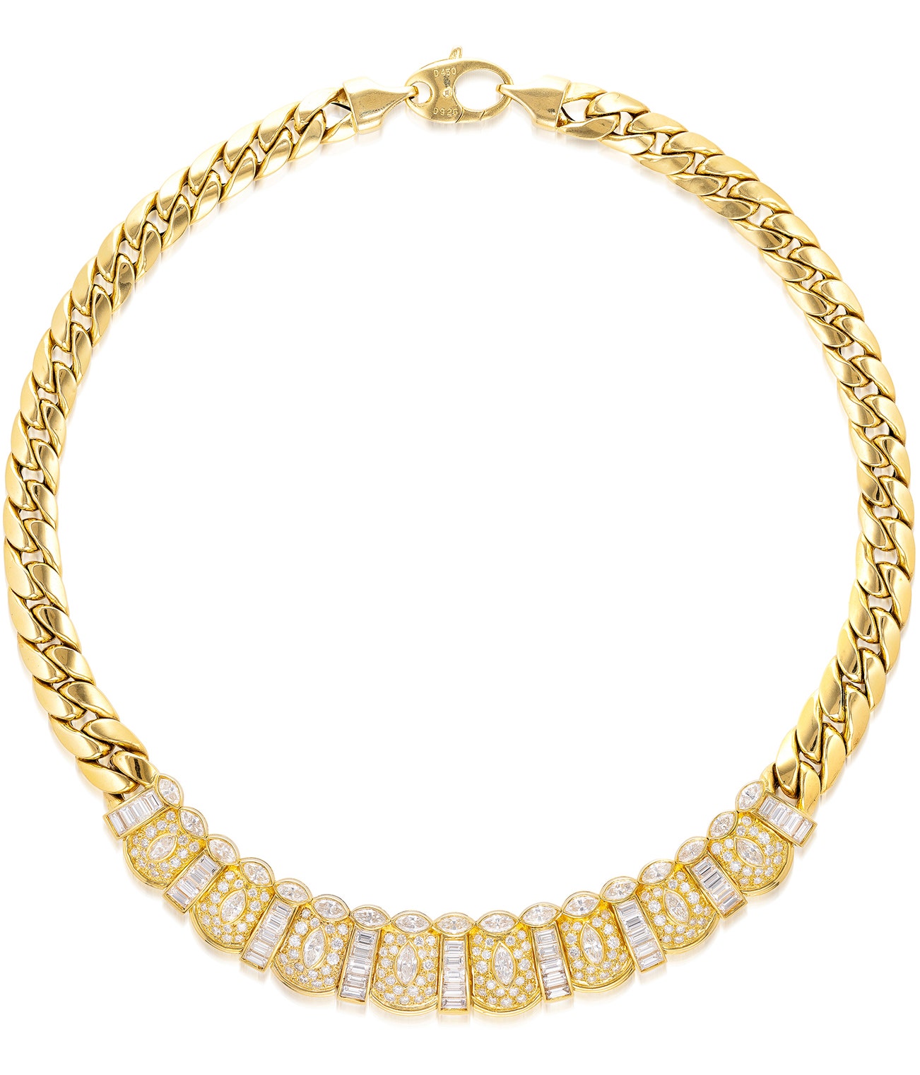 Set with marquise-shaped diamonds, decorated with baguette and brilliant-cut diamonds,