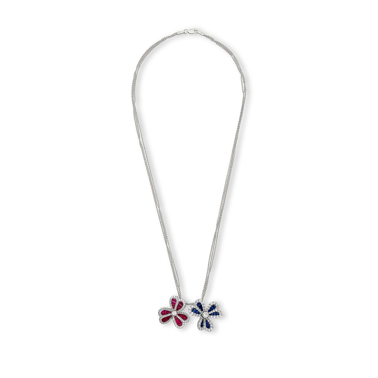 The flower pendants set with baguette rubies and sapphires, accented with brilliant-cut diamonds, suspended from a chain, length approximately 450mm.