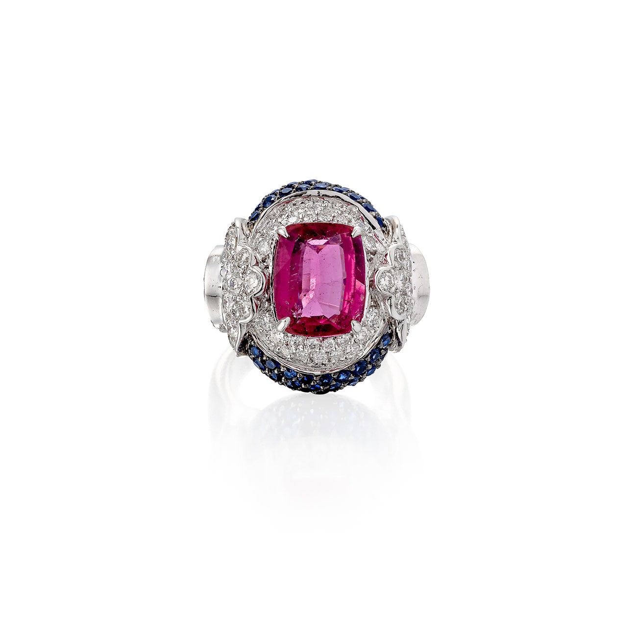 Set with a cushion-shaped pink tourmaline, accented with circular-cut sapphires and brilliant-cut diamonds, size 54.