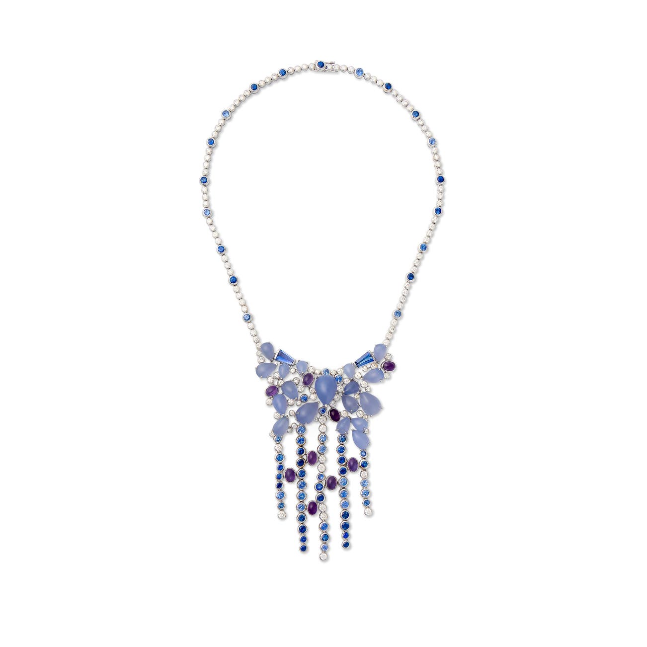 Set with cabochon blue chalcedony and amethyst, circular-cut and trapeze-shaped sapphires, and brilliant-cut diamonds, length approximately 455mm, Italian assay mark for gold.