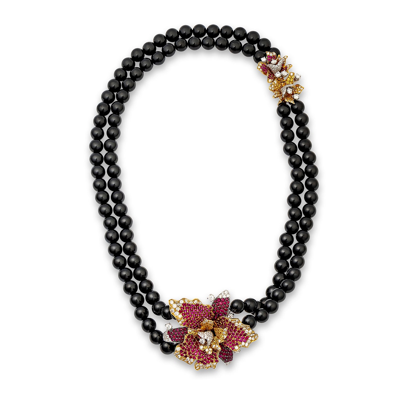 Composed of two rows of onyx beads, embellished with floral motifs set with circular-cut rubies and yellow sapphires, accented with brilliant-cut diamonds, length approximately 420mm, Italian assay mark for gold.