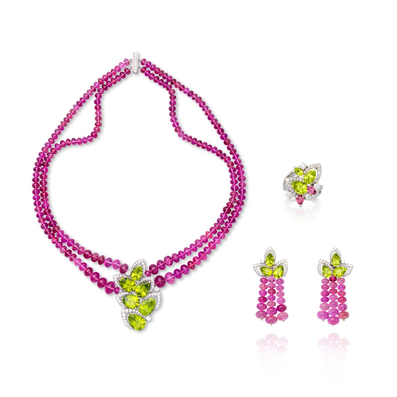 Comprising: a necklace, composed of two rows of graduated pink tourmaline beads, the central element set with pear-shaped peridots and brilliant-cut diamonds, length approximately 432mm, a pair of earrings, length approximately 54mm, collapsible posts and hinged-back fittings, and a ring, size 54, Italian assay marks for gold.