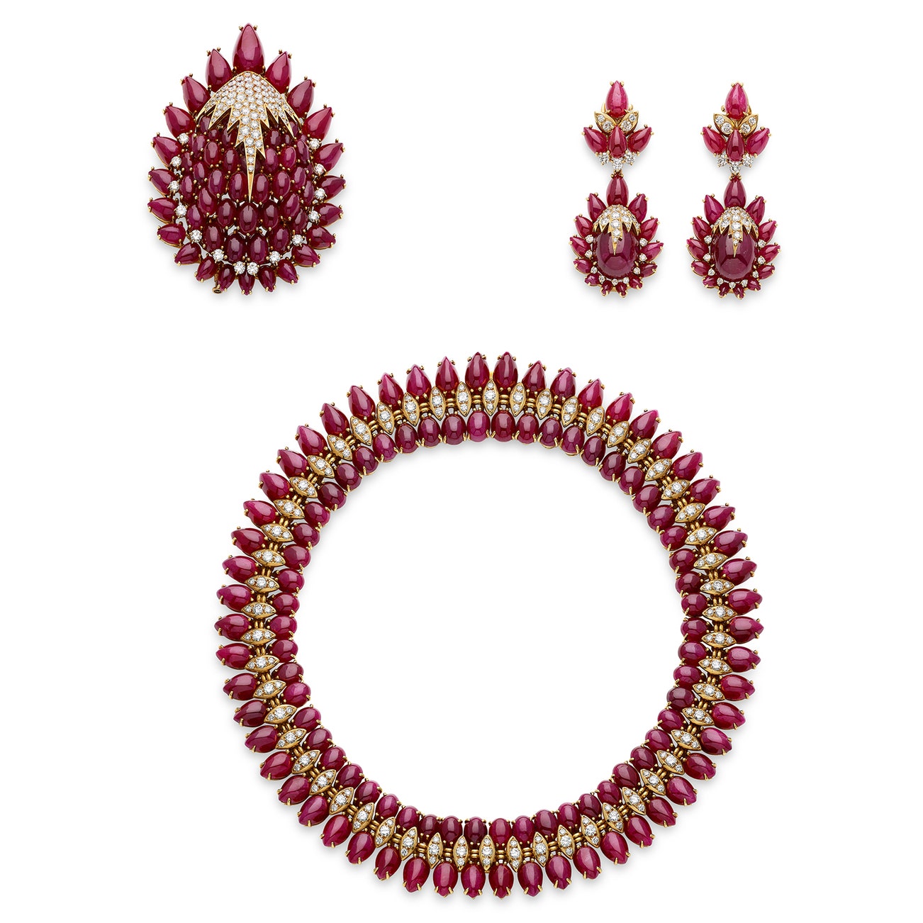 Comprising: a necklace, set with pear-shaped and oval cabochon rubies, accented with brilliant-cut diamonds, length approximately 420mm, the pendant detachable and may be worn as a brooch, measuring approximately 70 x 55mm, and a pair of ear clips, length approximately 60mm, the pendants detachable, French maker’s marks and assay marks for 18k gold.