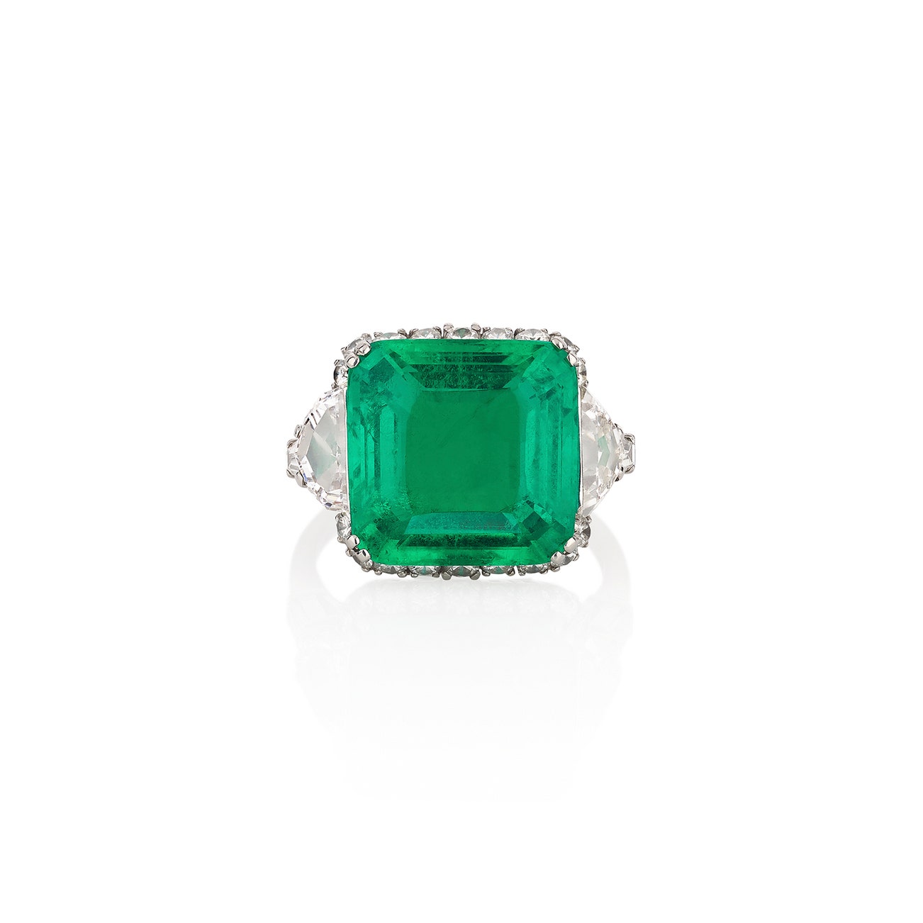 Set with a step-cut emerald weighing 9.98 carats between shield-shaped diamonds, accented with brilliant-cut and tapered baguette diamonds, size 53.