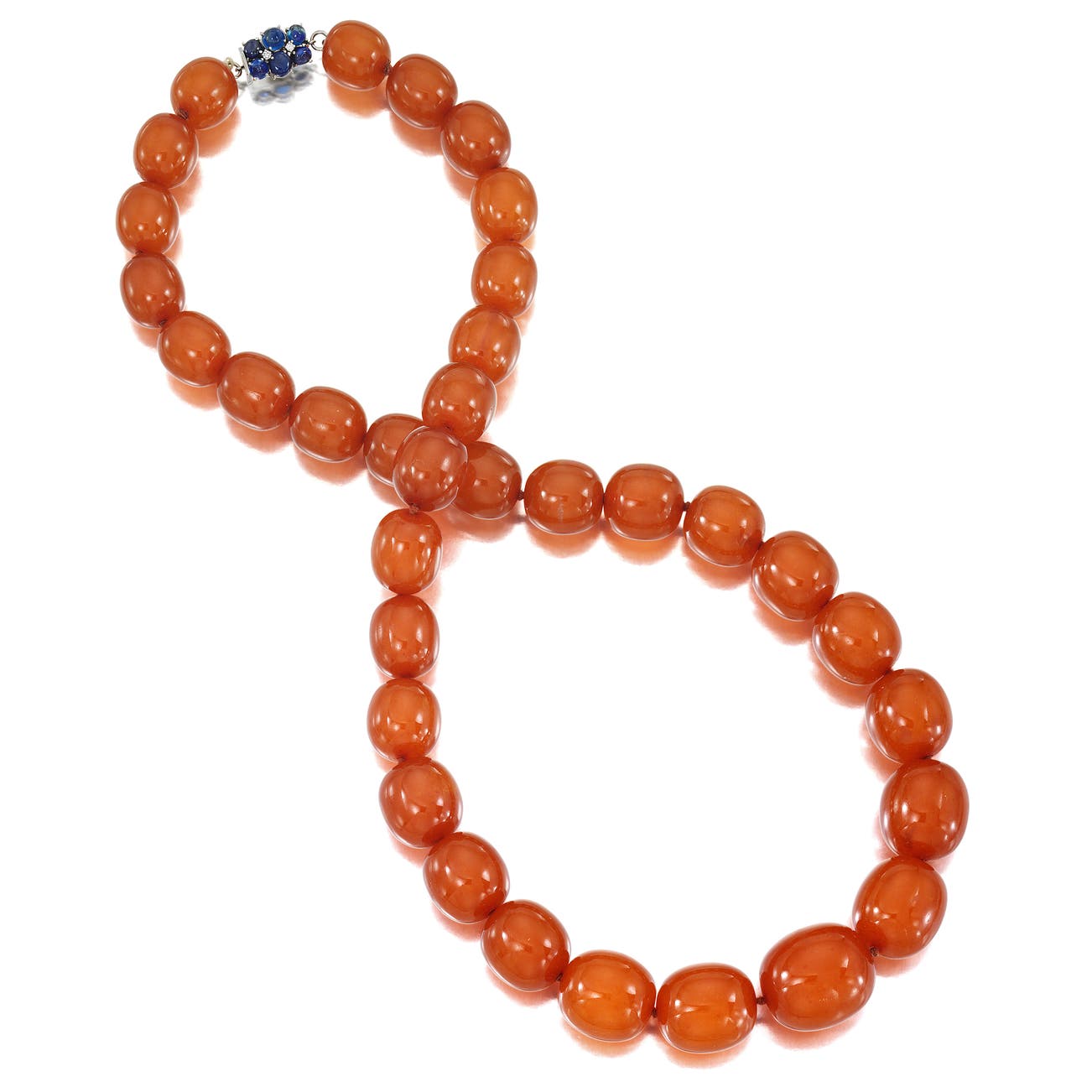 Composed of graduating amber beads, the clasp set with cabochon blue sapphires, accented by single-cut diamonds, mounted in platinum, length approximately 27 inches.