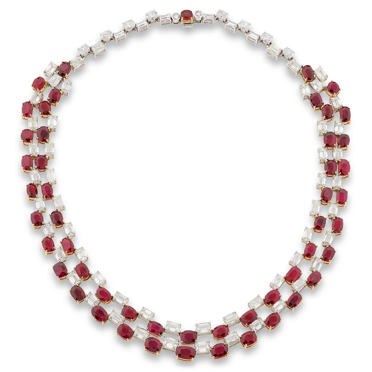 Composed of two rows, set with oval and cushion-shaped rubies alternating with step-cut, oval and brilliant-cut diamonds, length approximately 400mm.