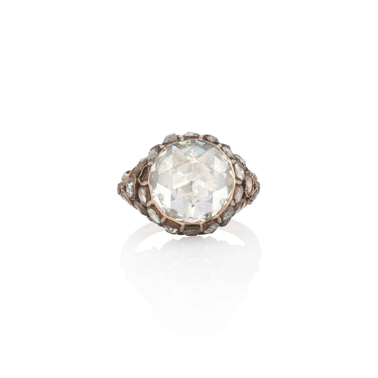 Set with a rose-cut diamond weighing 3.91 carats, the shoulders highlighted with rose-cut diamonds,