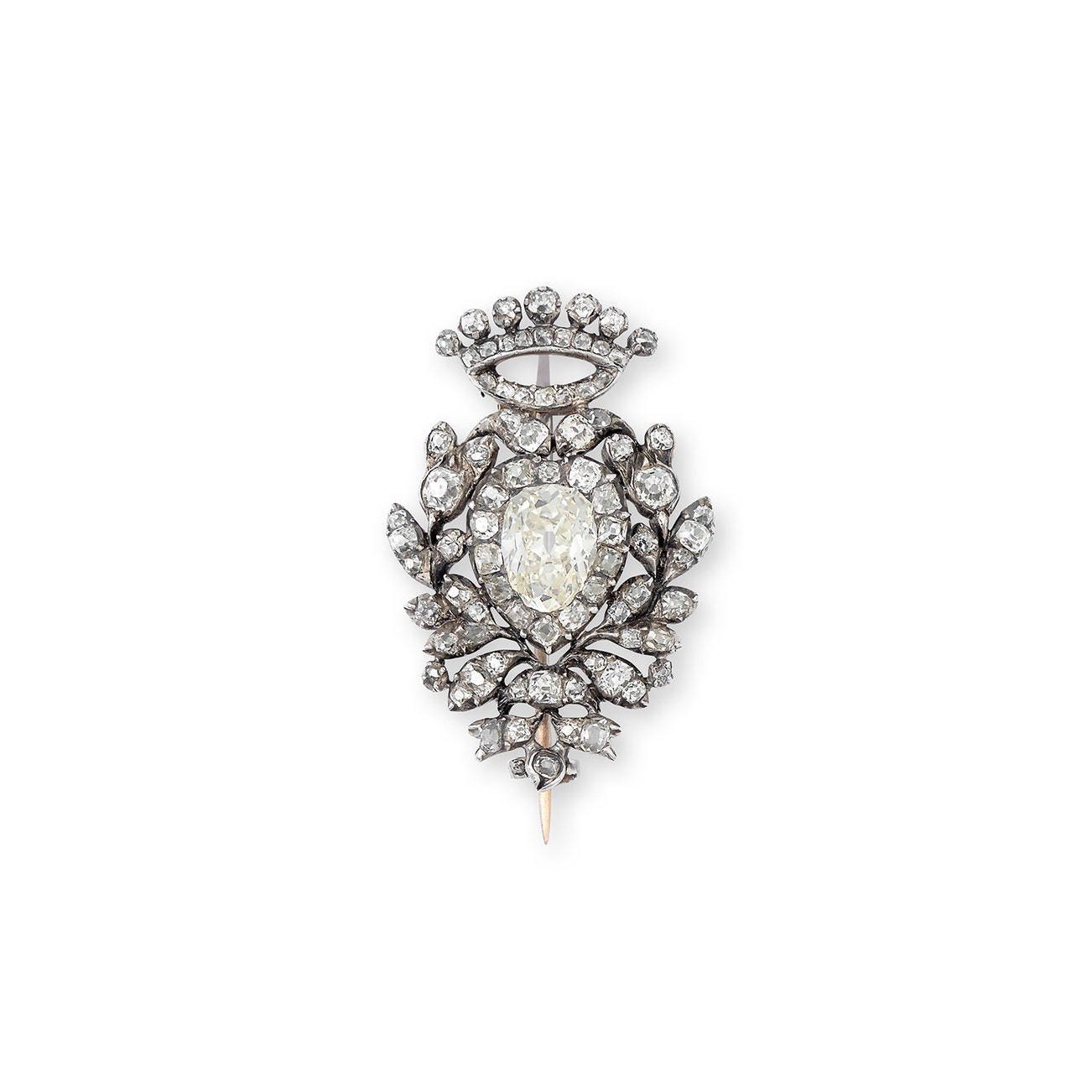 Designed as a coat of arms surmounted by a crown, set at the centre with a pear-shaped diamond, accented with circular-cut and cushion-shaped diamonds, measuring approximately 34 x 21mm.