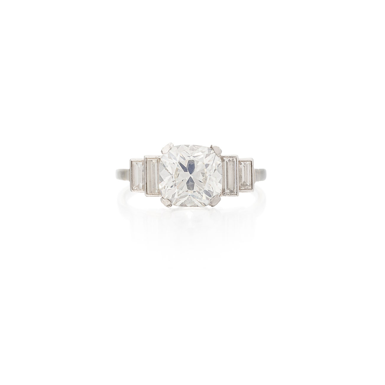 Set with a cushion-shaped diamond weighing 2.37 carats, between graduated baguette diamonds,