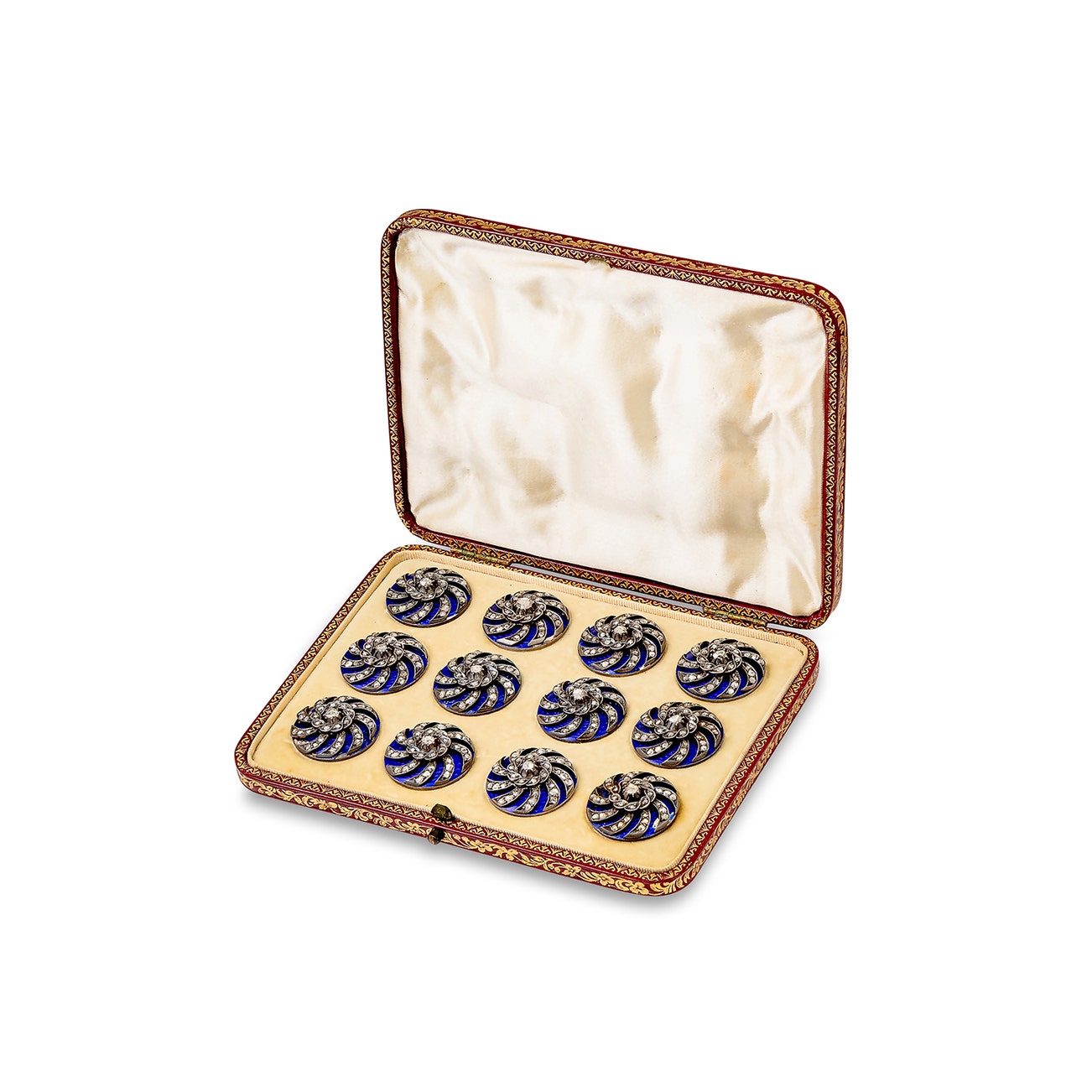 Each applied with blue enamel and rose-cut diamonds, each with a diameter of approximately 25mm, fitted case, some areas of loss to the enamel.