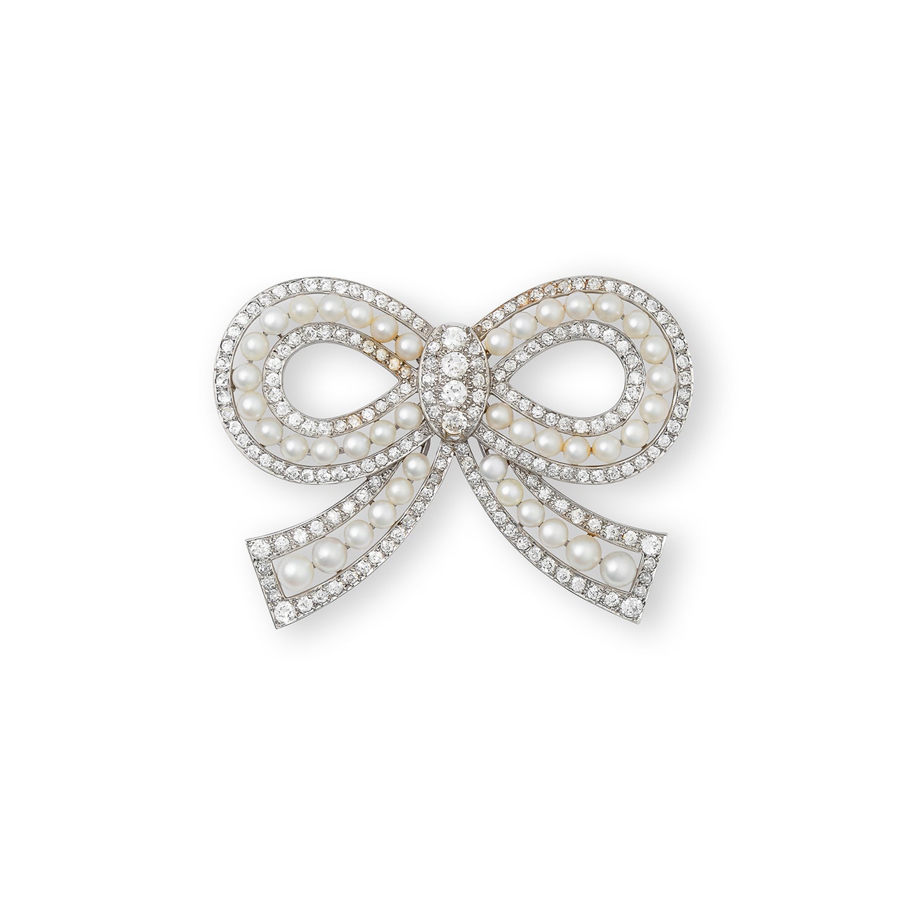 Modelled as a bow, set with pearls measuring from approximately 3.70mm to 5.12mm, accented with circular-cut diamonds, measuring approximately 47 x 66mm.